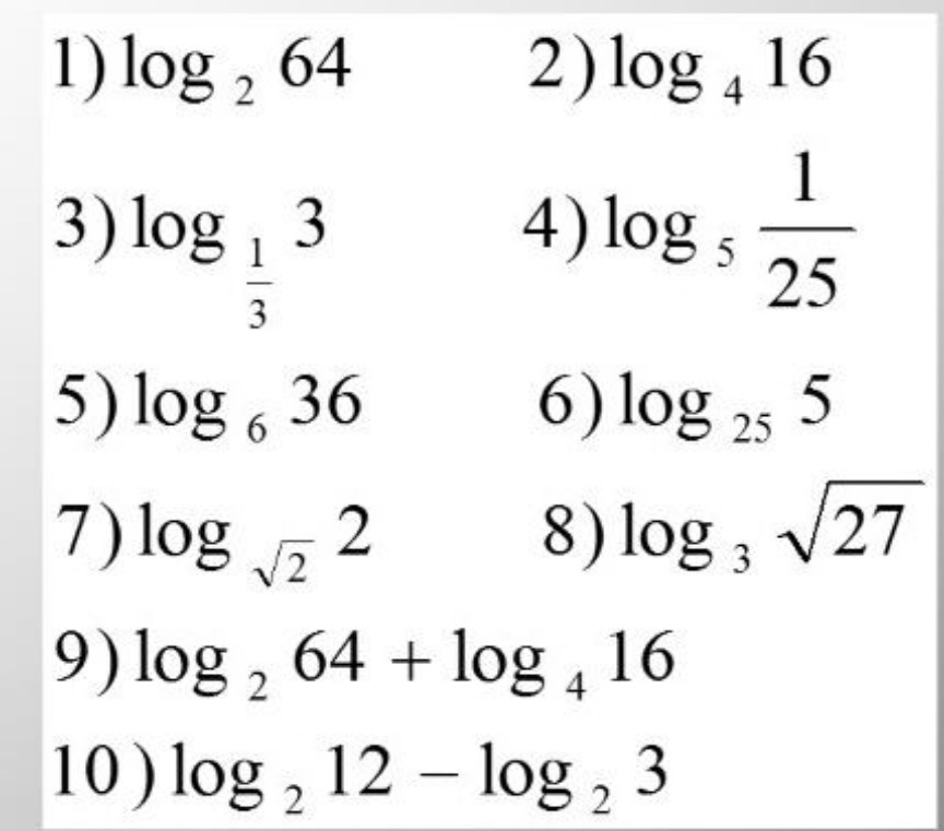 1) log_264=log_22^6=6;\2)log_416=log_44^2=2;\3)log_frac{1}{3}3=log_{3^{-1}}3=-log_33=-1;\4)log_5frac{1}{25}=log_55^{-2}=-2;\5)log_636=log_66^2=2;\6)log_{25} 5=log_{5^{2}}5=frac{1}{2}log_55=frac{1}{2};\ 7)log_{sqrt{2}}2= log_{2^{frac{1}{2} } } 2=2log_22=2;\8)log_3sqrt{27} =log_3sqrt{9*3}=log_3sqrt{9} +log_3sqrt{3} =1+frac{1}{2}=1,5;\ 9)log_264+log_416=log_22^{6}+log_44^2=6+2=8;\ 10)log_212-log_23=log_2frac{12}{3}=log_24=log_22^2=2.