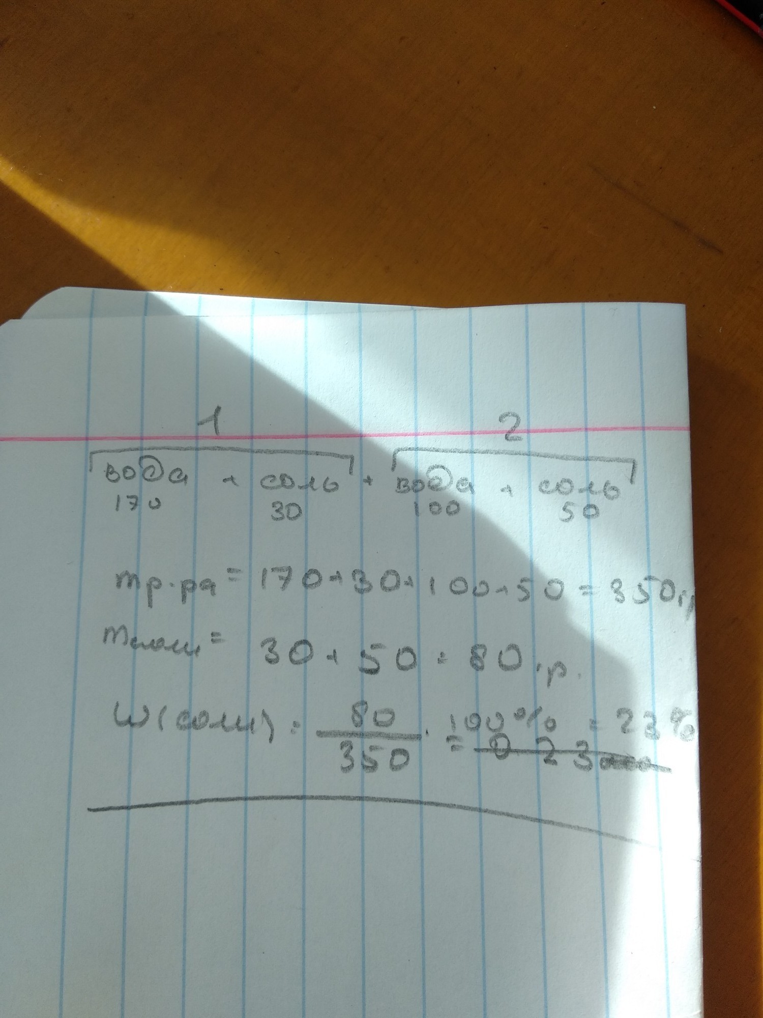 К раствору из 170 г воды и 30 г соли, добавили 100 г воды и 50 г той же соли. Вычислите массовую долю соли в полученном растворе. Помогите, пожалуйста. У нас контрольная, а я не разобрался в новой теме