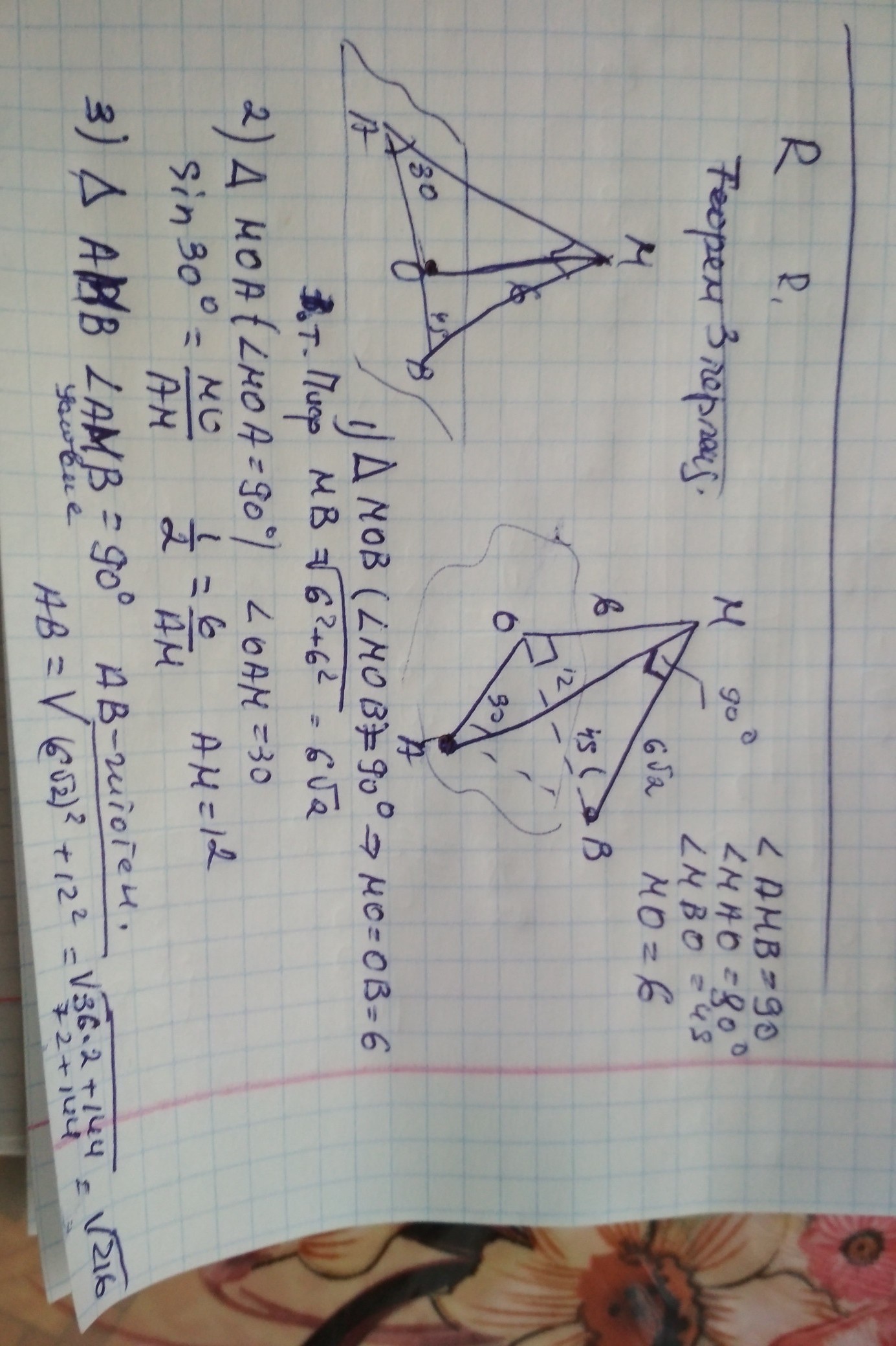 из точки находящейся на расстоянии 6 см от плоскости проведены наклонности, каждая из которых образует с плоскостью 45° и 30° . накланности перпендикулярны между собой , найдите расстояние основании наклонностей