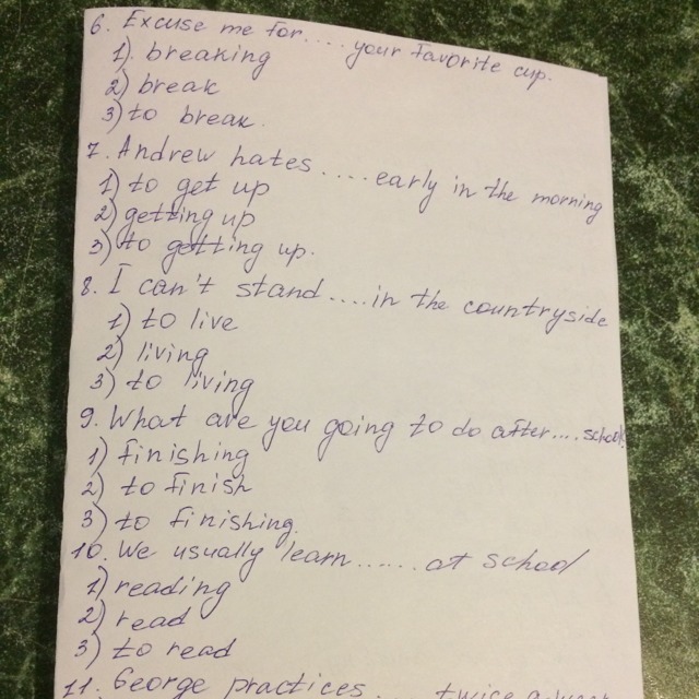 6. breaking 7 getting up 8 living 9 finishing 10 to read