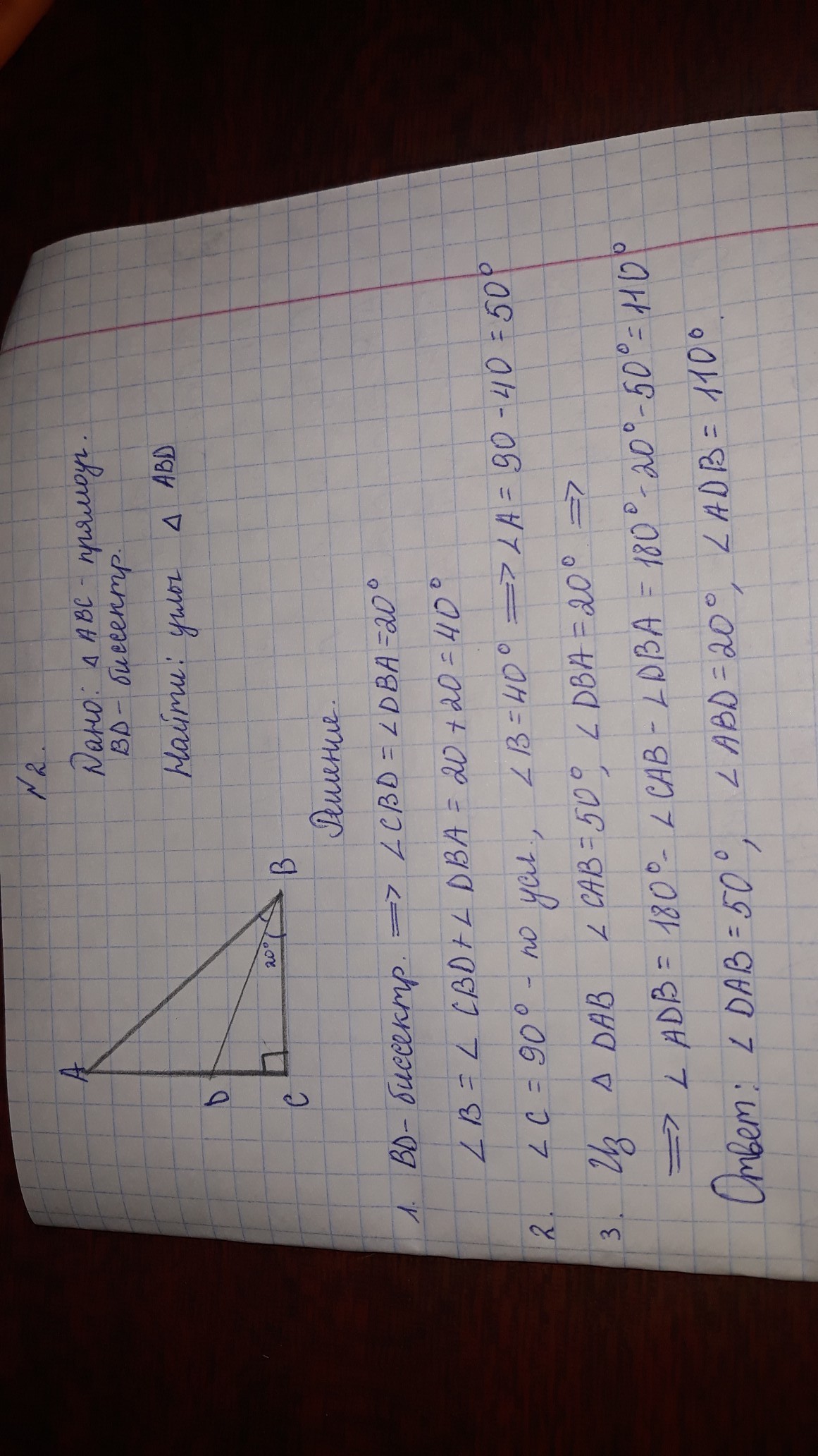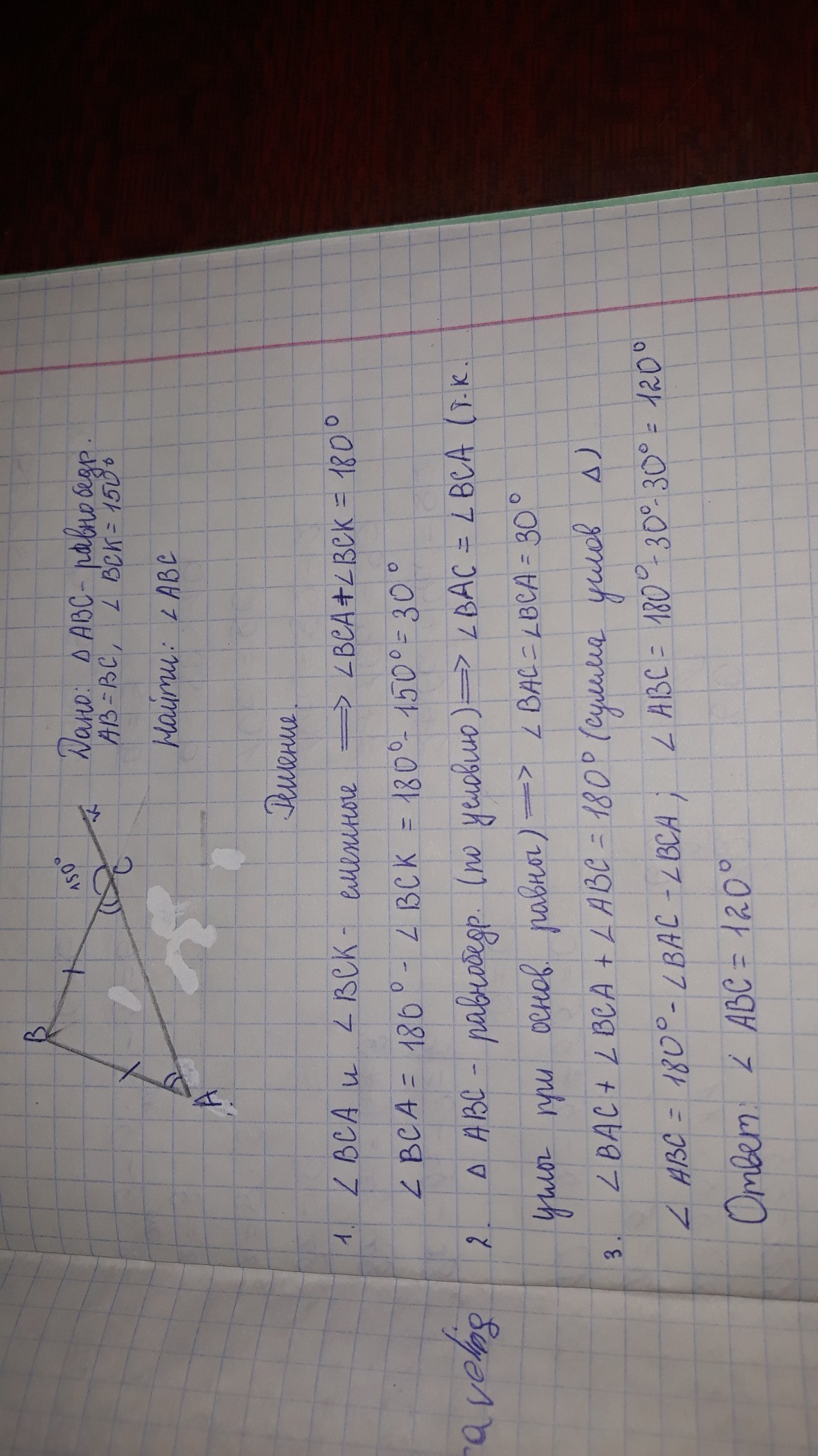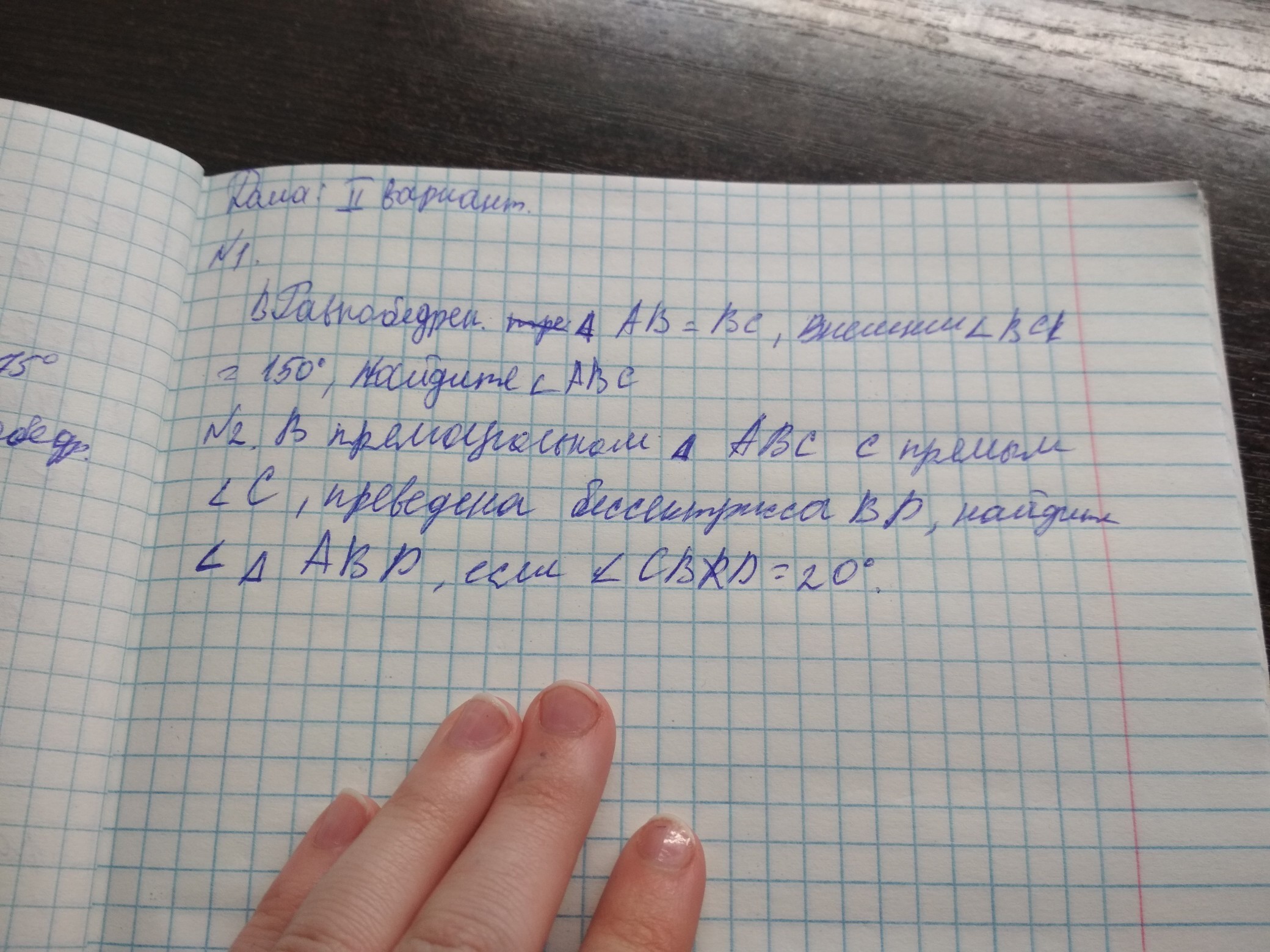 Кто не понял что написано то вот".НОМЕР1: В равнобедренном треугольнике AB=BC, внешний угол BCK=150°,найдите угол ABC.",, НОМЕР2:в прямоугольном ТРЕУГОЛЬНИКЕ ABC,с прямым углом С, переведена бессектрисса BD, найдите угол треугольника ABD, если угол CBD равен 20°