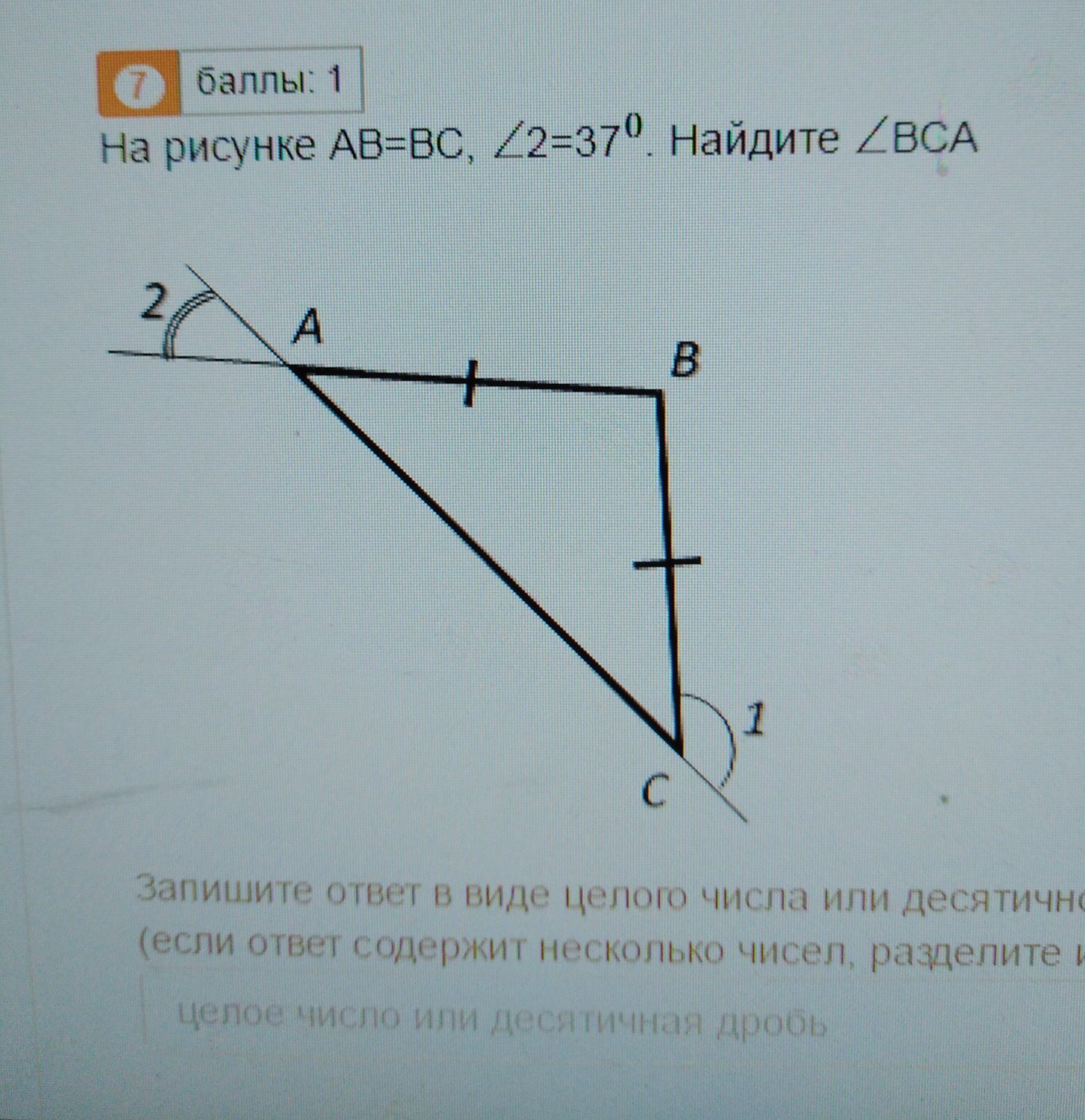 На чертеже ∠ 2 вертикальный с ∠ А, следовательно они равны по свойству вертикальных углов и ∠А=37°. ∠А= ∠С, так как это углы при основании, а углы при основании равны, значит ∠С=37°. Вроде так, не судите меня строго. Надеюсь, что правильно