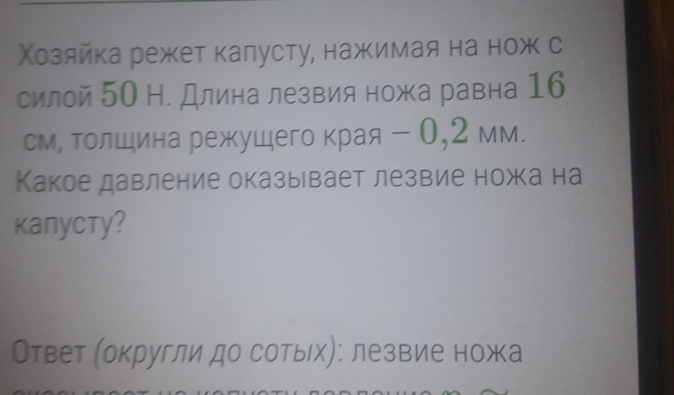p = F / S = 50 Н / 0,000024 м² = 208 3333,3 Па = 2083,3 кПа