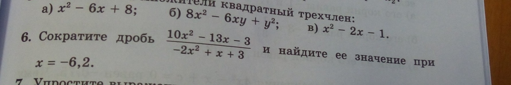frac{10 {x}^{2} - 13x - 3 }{ - 2 {x}^{2}  + x + 3}  =   - frac{5x + 1}{x + 1}  =   \ -  frac{5 times ( - 6.2) + 1}{ - 6.2 + 1}  =  -  frac{75}{13}