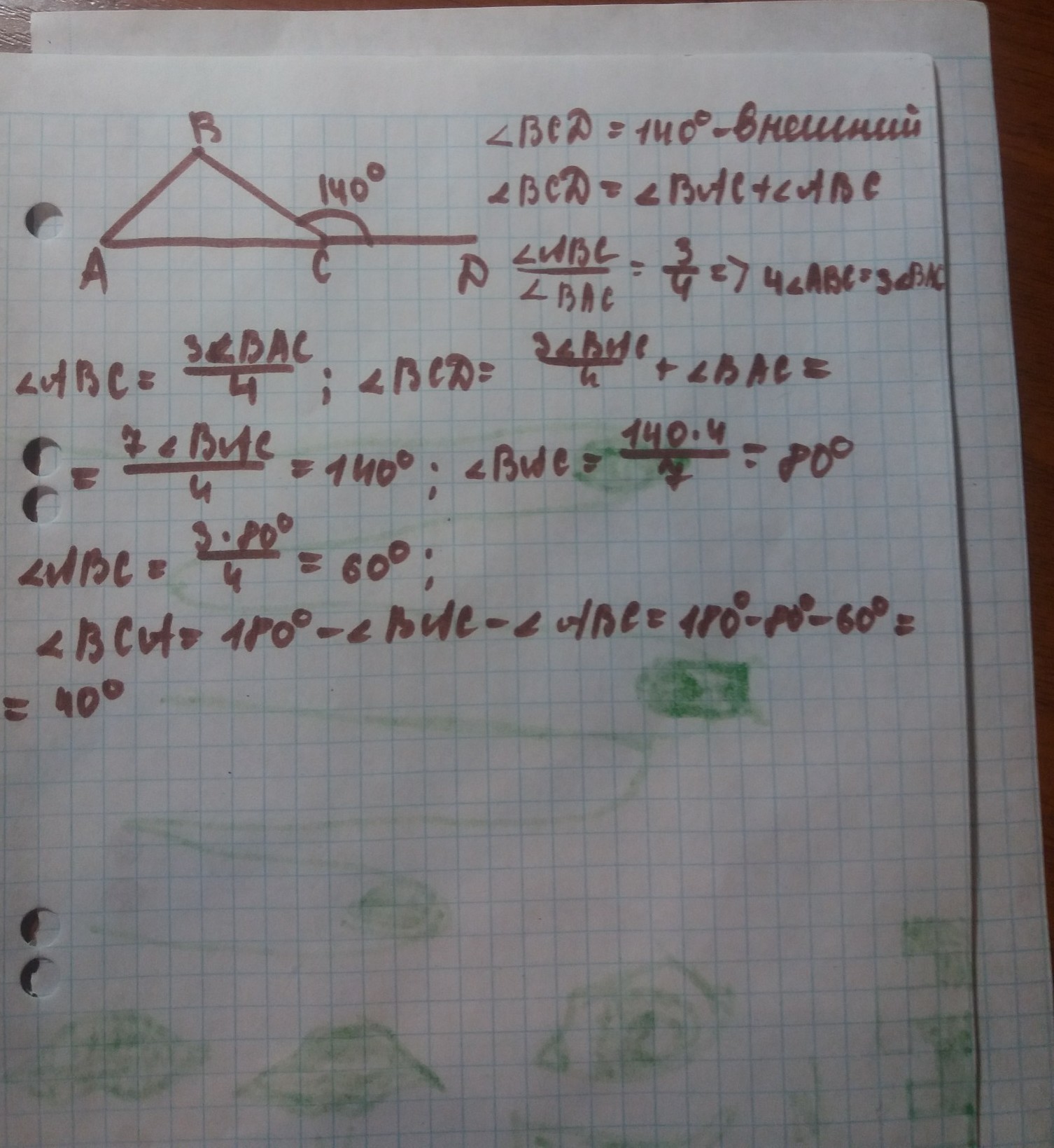 Внешний угол треугольника равен 140 градусов а внутренние углы не смежные с ним относятся как 3:4. Найдите разность наибольшего и наименьшего углов треугольника.