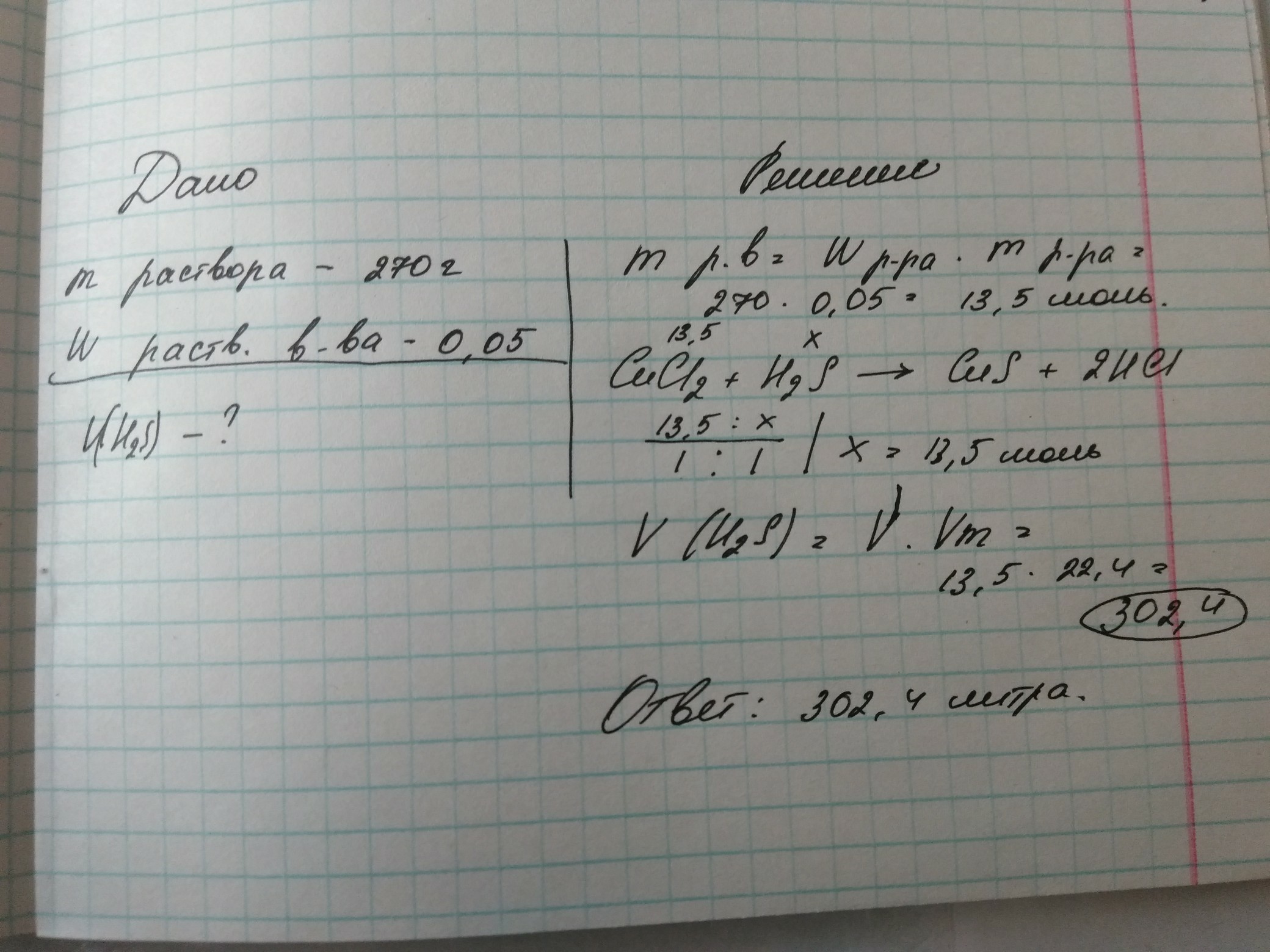 Какой объём сероводорода требуется пропустить через 270 г 5% раствора хлорида меди чтобы полностью осадить всю медь