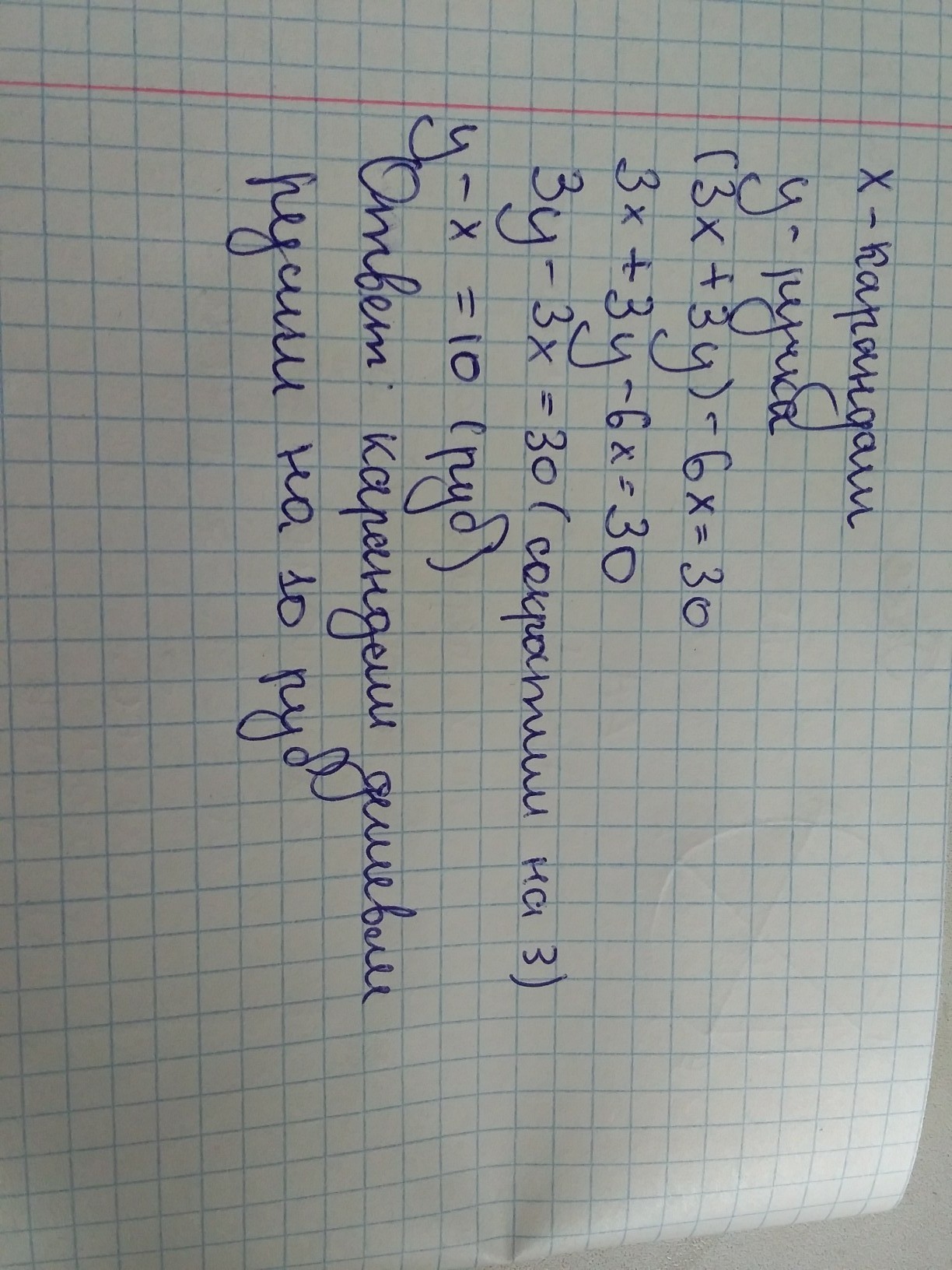 6 карандашей стоят на 30 рублей дешевле, чем 3 ручки и 3 карандаша.