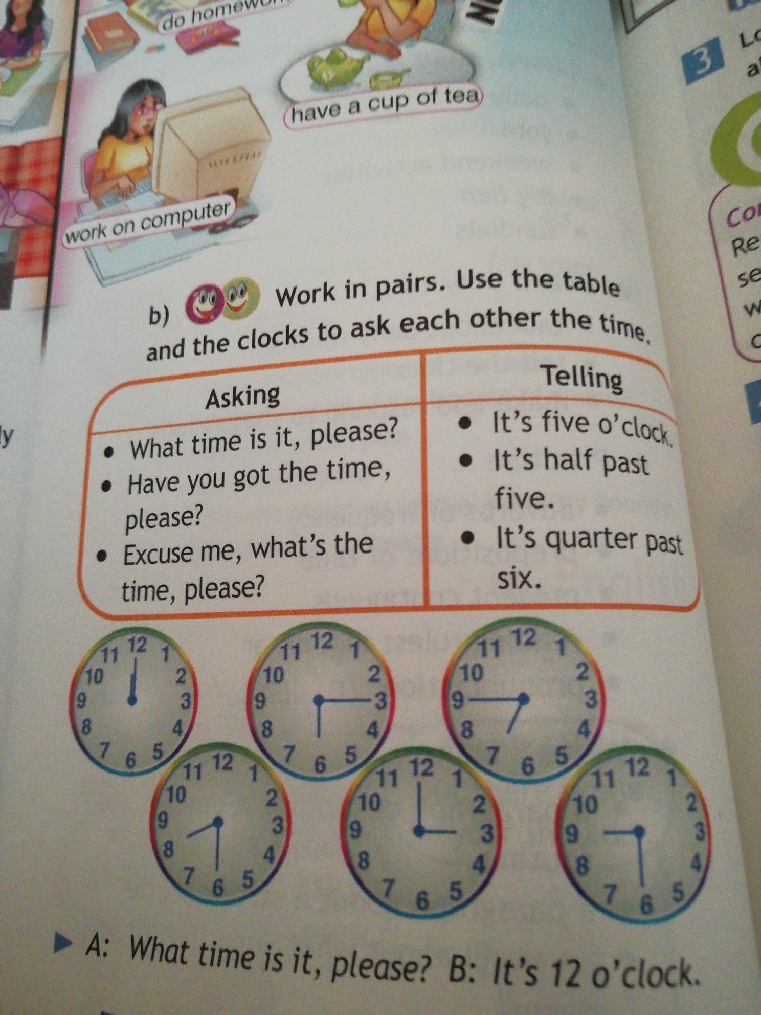 •Excuse me, what’s the time, please? – It’s three o’clock