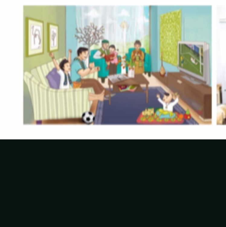 Семья. Все в комнате. Отец и сын смотрят телевизор. Показывают футбол. Они болеют за команду.
