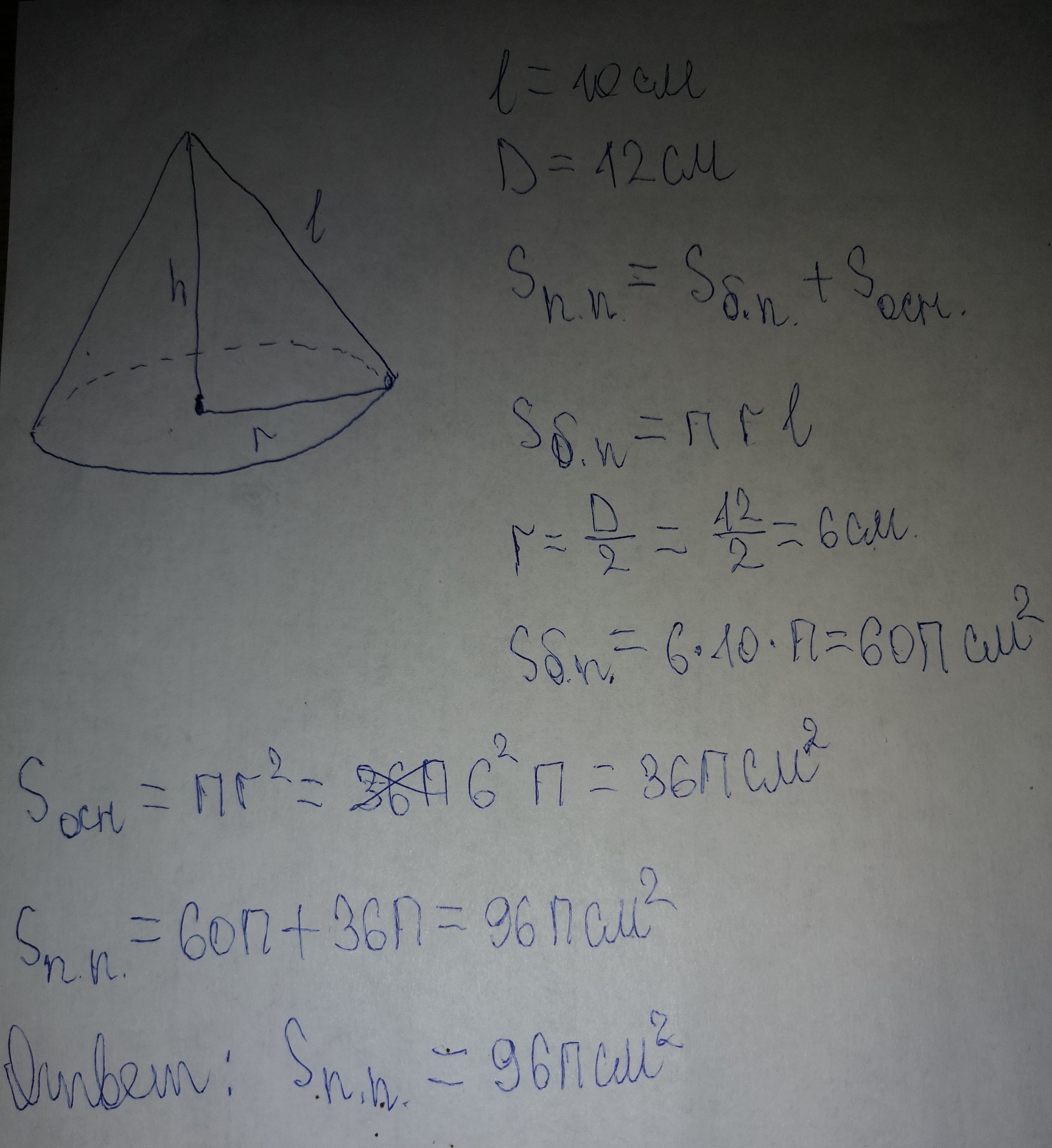 Найти площадь полной поверхности конуса, если диаметр основания равен 12 см, а образующая - 10 см.
