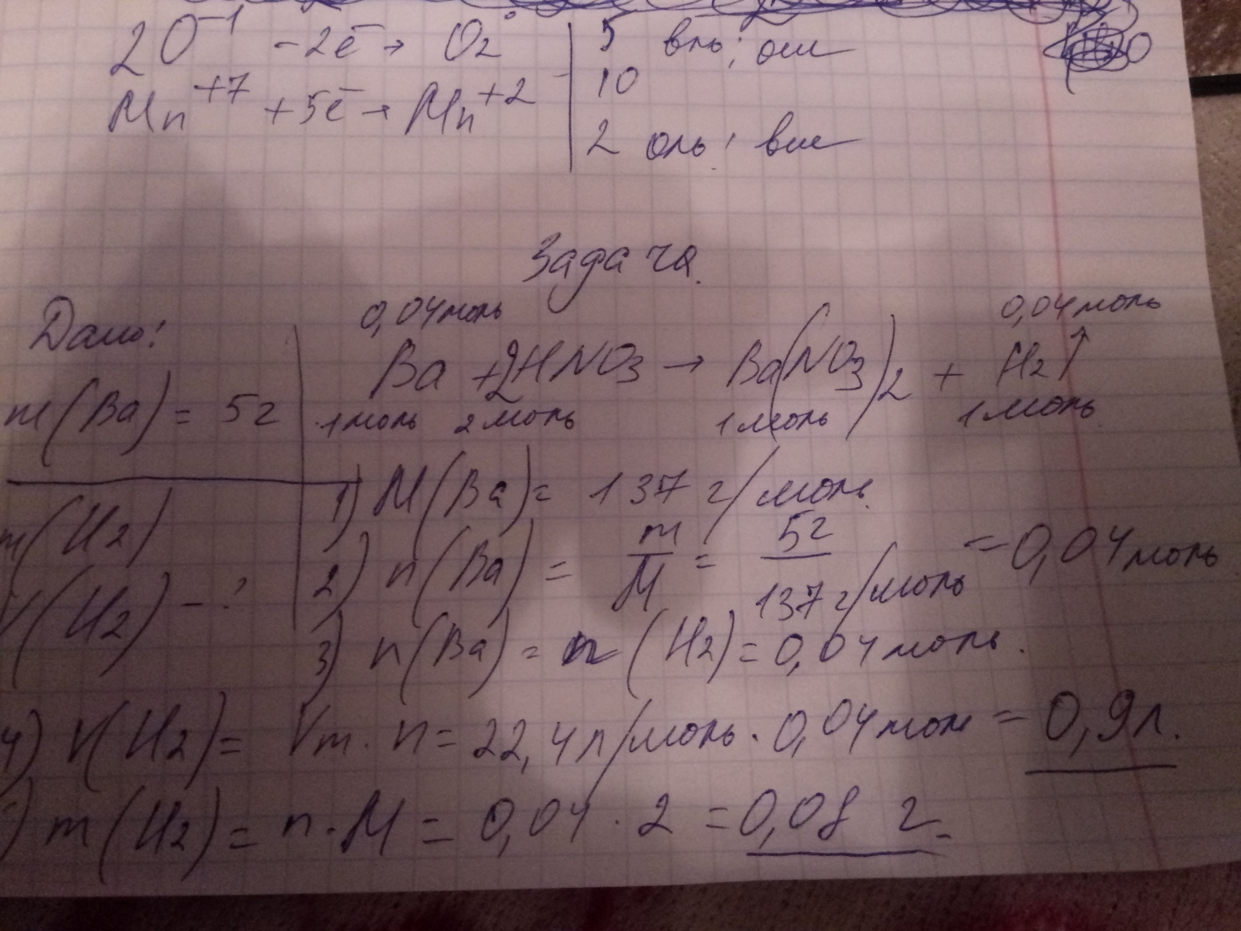 Помогите пожалуйста .Надо сделать в виде таблицы. вычислите массу и объём водорода (н.у),выделившегося при взаимодействие 5 г бария с азотноц кислотой