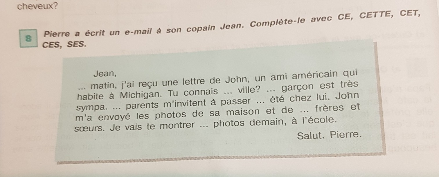 Ce matin, j'ai reçu une lettre de John, un ami américain qui habite à Michigan. tu connais cette ville? Ce garçon est très sympa. Ses parents m'invitent à passer cet été chez lui. John m'a envoyé les photos de sa maison et de ses frères et sœurs. Je vais te montrer ces photos demain à l'école.