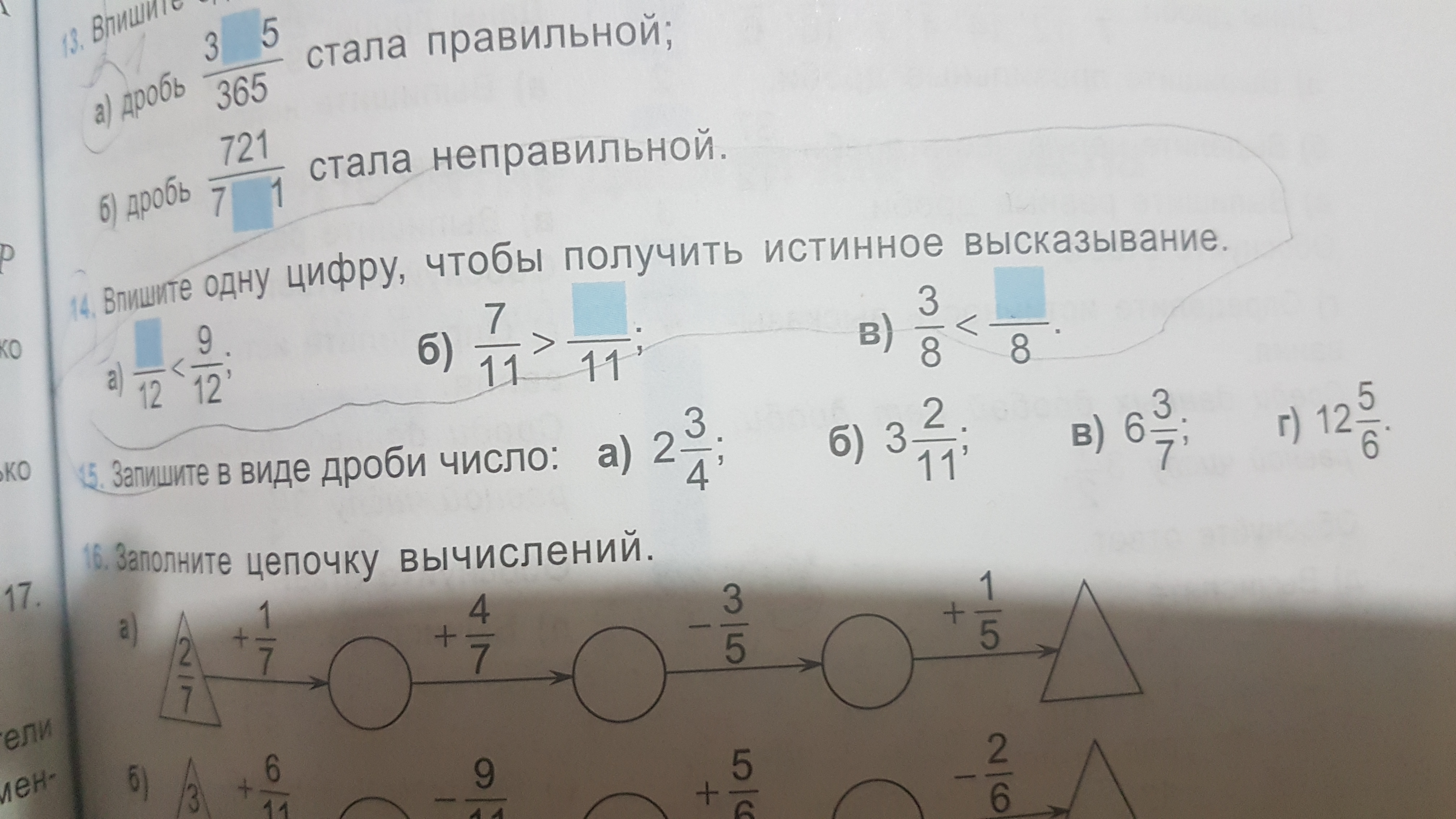 а) 2/7+1/7=3/7+4/7=7/7=1-3/5=2/5+1/5=3/5