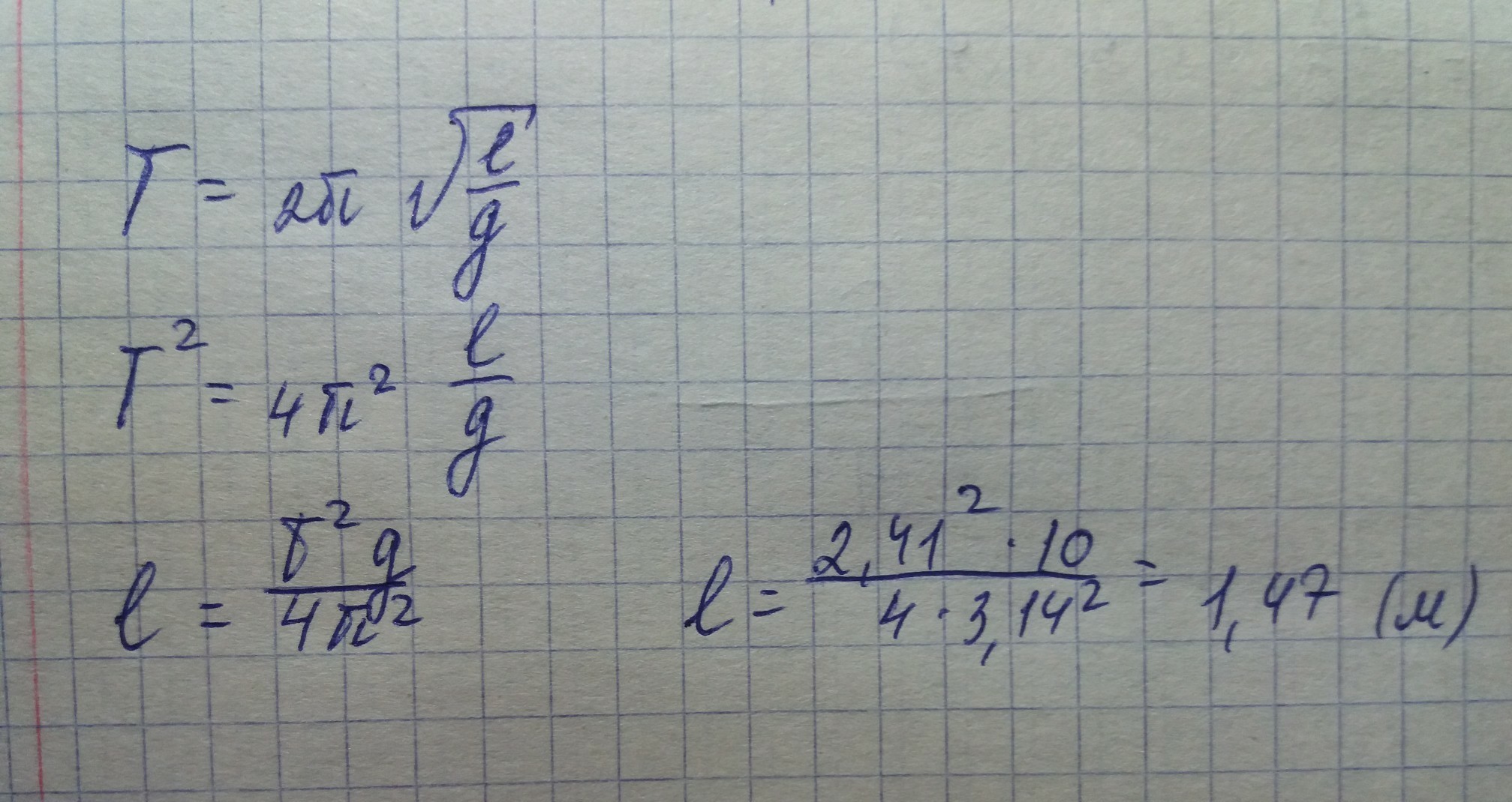 Математический маятник подвешен вблизи вертикальной стены и колеблется в плоскости, параллельной стене. В стену вбит тонкий гвоздь так, что середина нити маятника наталкивается на него каждый раз, когда маятник проходит положение равновесия справа налево. Найдите длину нити, если период колебаний такого маятника (с помехой в виде гвоздя) T=2,41с. Ускорение свободного падения g=10м/с^2