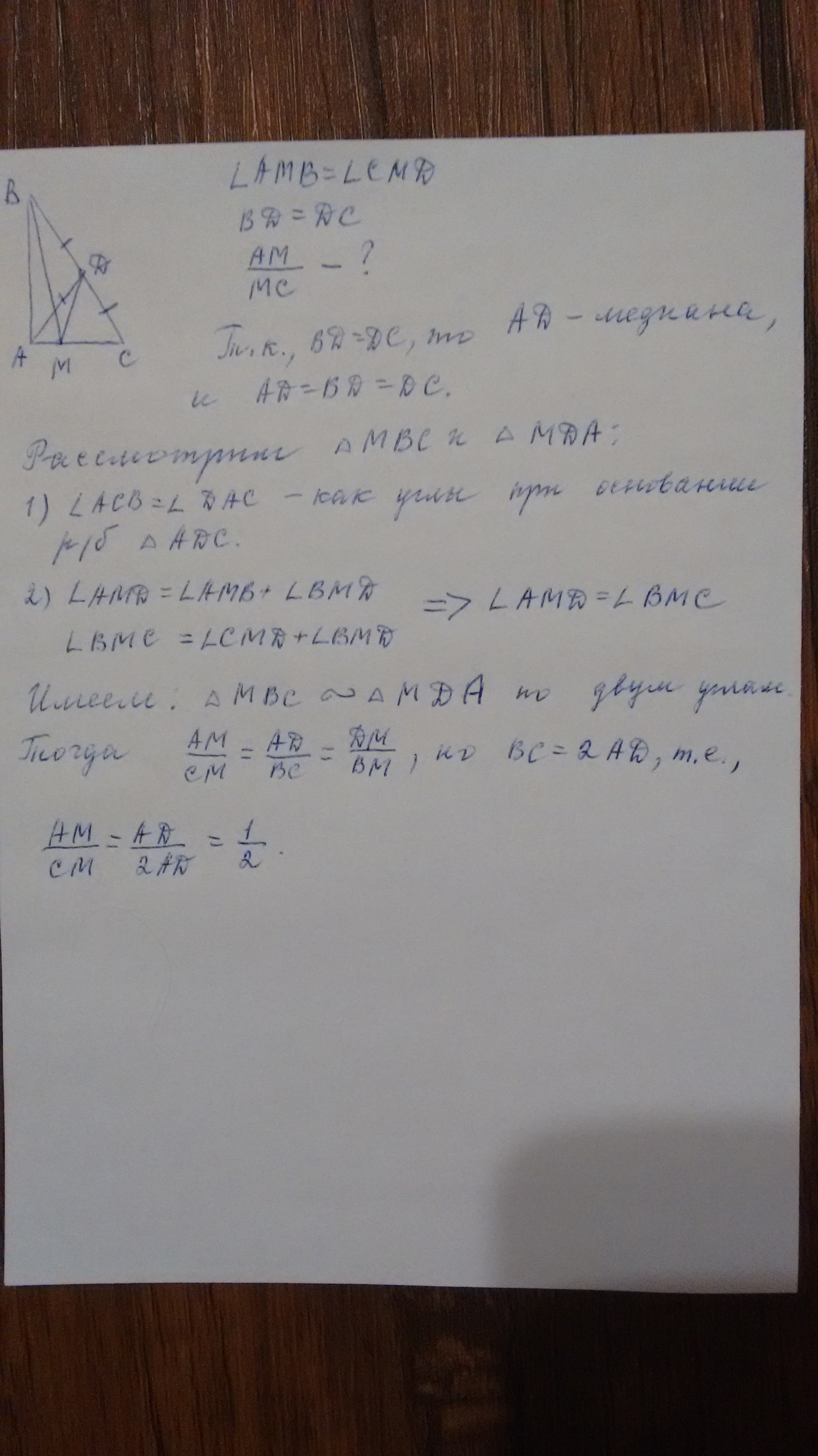 Пусть D- середина гипотенузы BC прямоугольного треугольника ABC. На катете AC выбрана точка М, что угол AMB=углу CMD. Найдите отношение AM/MC
