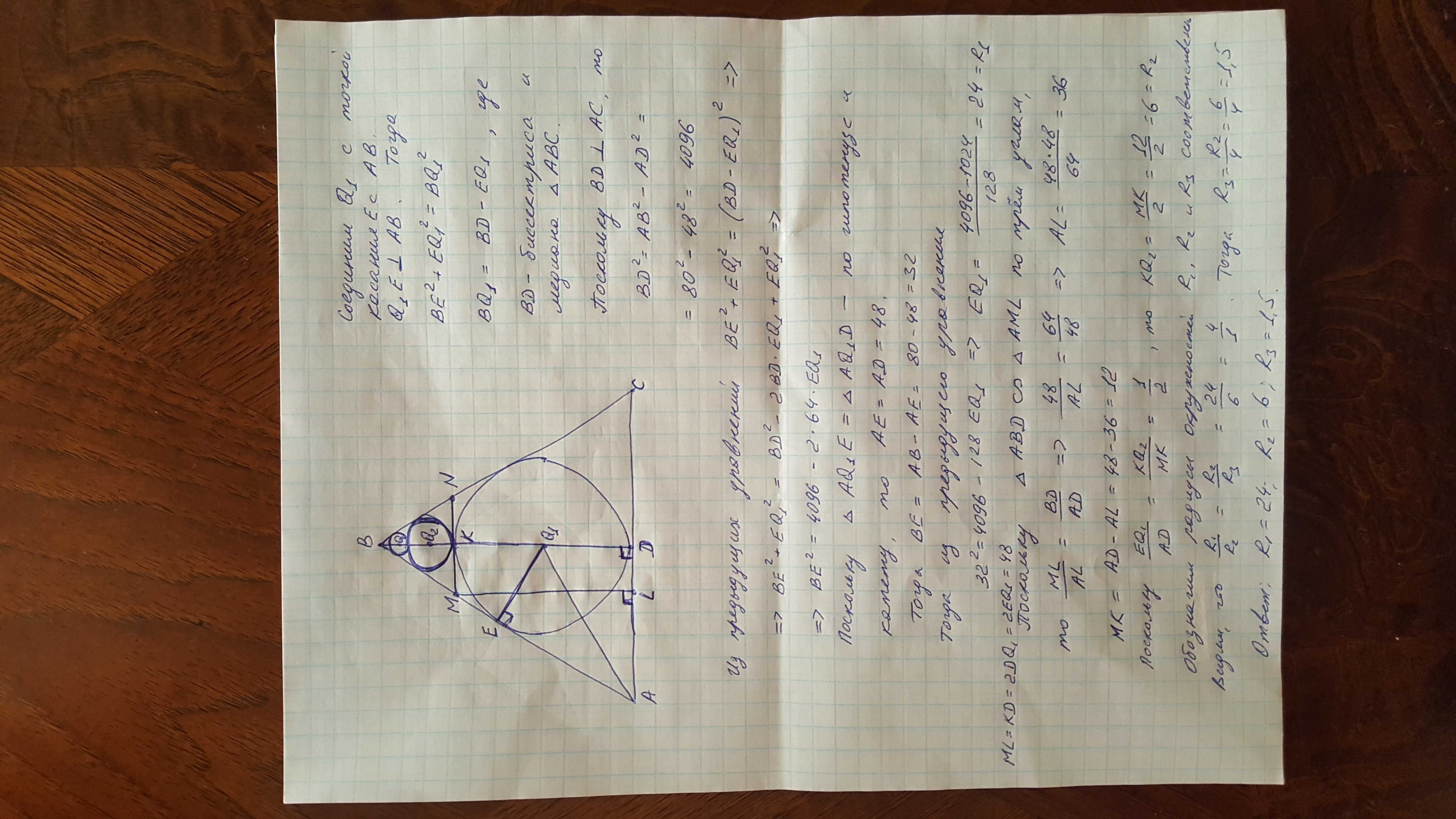 Дан треугольник АВС. Известны длины его сторон: АВ=ВС=80, АС=96. Окружность Q1 вписана в треугольник АВС. Окружность Q2 касается Q1 и также сторон АВ и ВС. Окружность Q3 касается Q2 и также сторон АВ и ВС. Найдите радиус окружности Q3 .