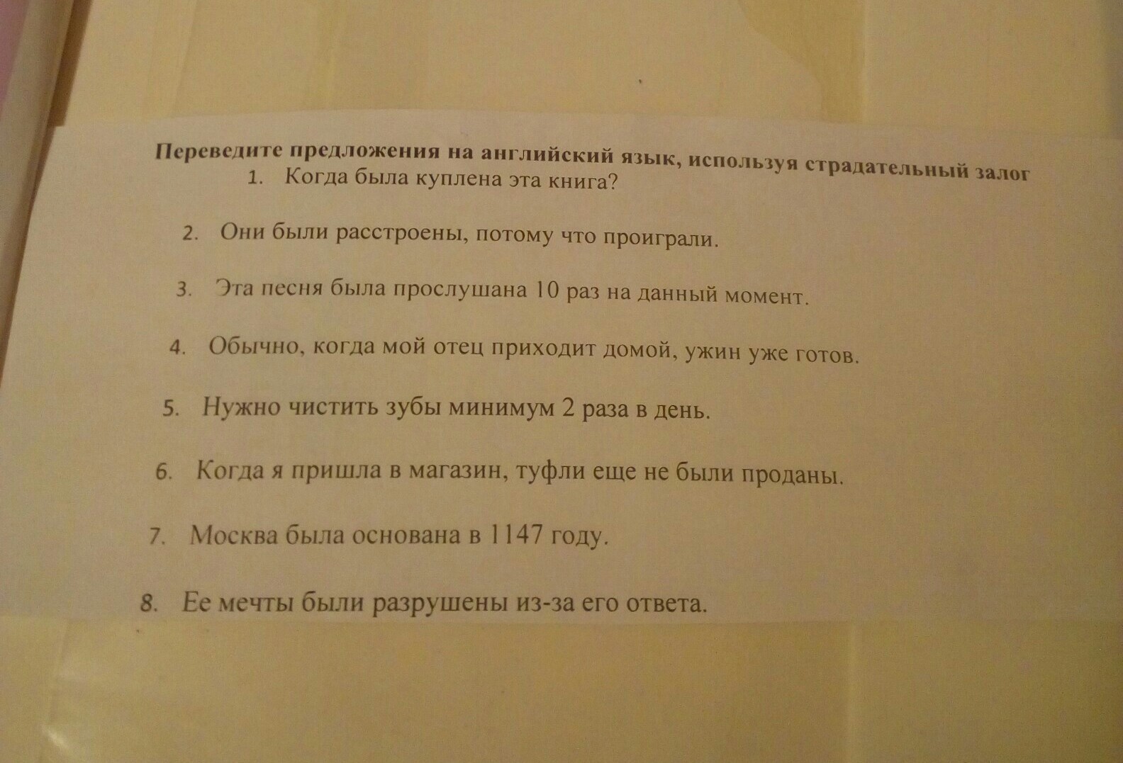 1. When was this book purchased? 2. They were upset because they lost. 3.This song has been heard 10 times at the moment. 4. Usually, when my father comes home, dinner is ready. 5. It is necessary to brush your teeth at least 2 times a day. 6. When I came to the store, the shoes were not sold yet 7. Moscow was founded in 1147. 8. Her dreams were shattered by his response.