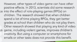 Тем не менее, другие типы видеоигр могут иметь другие положительные эффекты. В 2013 году ученые провели исследование влияния ролевых игр (РПГ) на детей. Исследование показало, что когда дети проводят много времени, играя в ролевые игры, они получают более высокие оценки в школе, чем дети, которые не играют в них. Другое исследование показало, что игра в любые видеоигры, включая жестокие игры, улучшает творческий потенциал детей. Но использование компьютера или смартфона для электронной почты или других задач не дает этой выгоды.