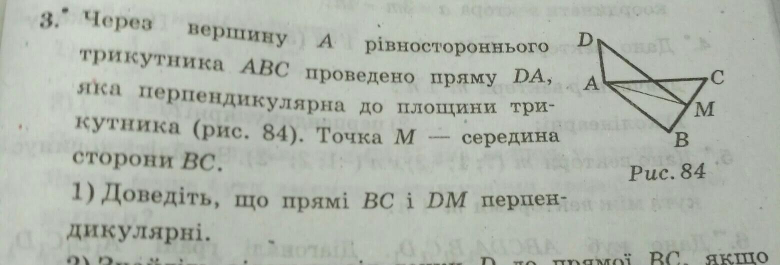 AM⊥BC т.к. AM это медина, а в равностороннем треугольнике это и высота. Тогда BC⊥ DA,AM --> BC⊥(DAM) --> BC⊥DM т.к. DM⊂(DAM). ну или по теореме о 3 перпендикуляр. что тоже самое.