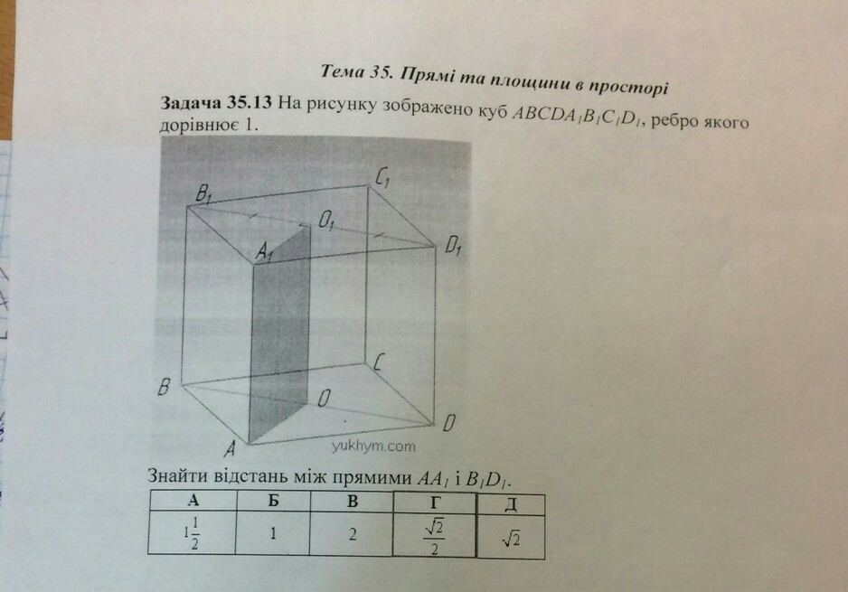 Так как фигура на рисунке является кубом со стороной, равной 1, то верхняя грань куба является квадратом с той же стороной. Диагонали квадрата пересекаются под прямым углом, следовательно, отрезок А₁О₁ перпендикулярен диагонали B₁D₁ и его величина является расстоянием между отрезками АА₁ и B₁D₁.