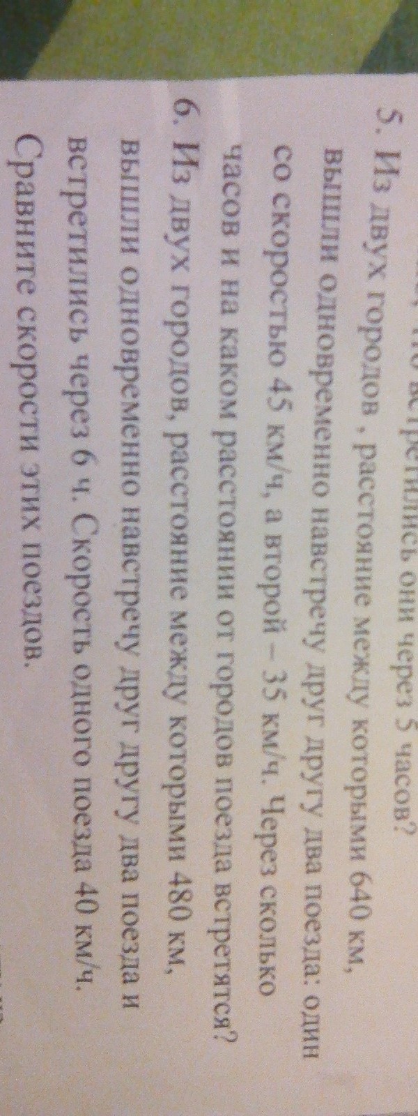 2) S=480км, где S - расстояние между городами, t=6ч (время встречи поездов), u1=40км/ч (скорость первого поезда). Скорость сближения u1+u2=s/t, отсюда u2=s/t-u1, тогда u2=480/6-40=80-40=40км/ч. Скорости поездов равны.