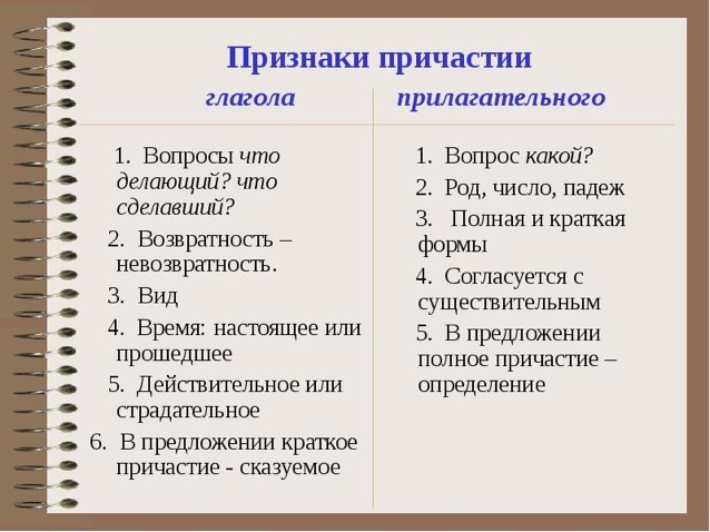 Причастие может обладать как признаками глагола (время, возвратность и вид) , так и признаками прилагательного (род, число и падеж) . Также причастия делятся на действительные и страдательные. Изменяется по числам и падежам, а в единственном числе и по родам. В предложении является определением, реже — сказуемым