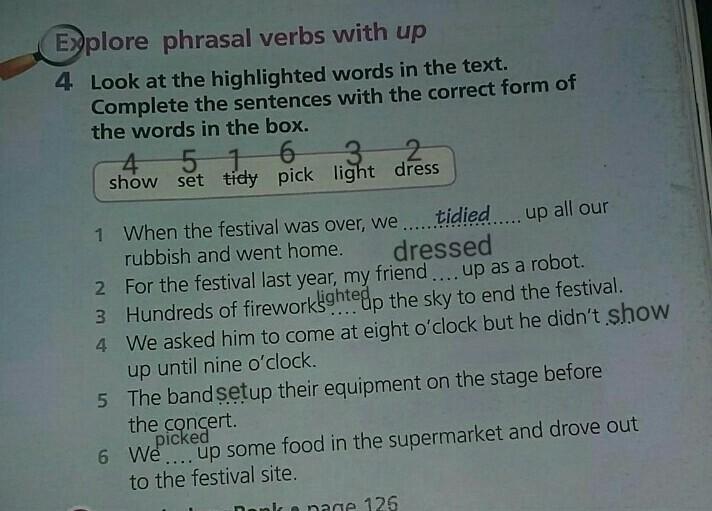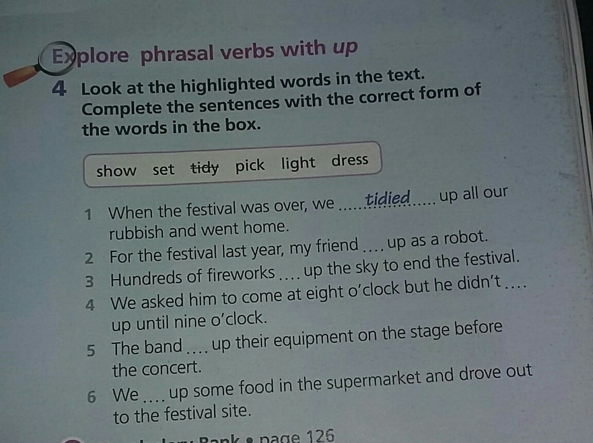 Look at the highlighted words in the text.Complete the sentences with the correct form of the words in the box.show set tidy pick light dress