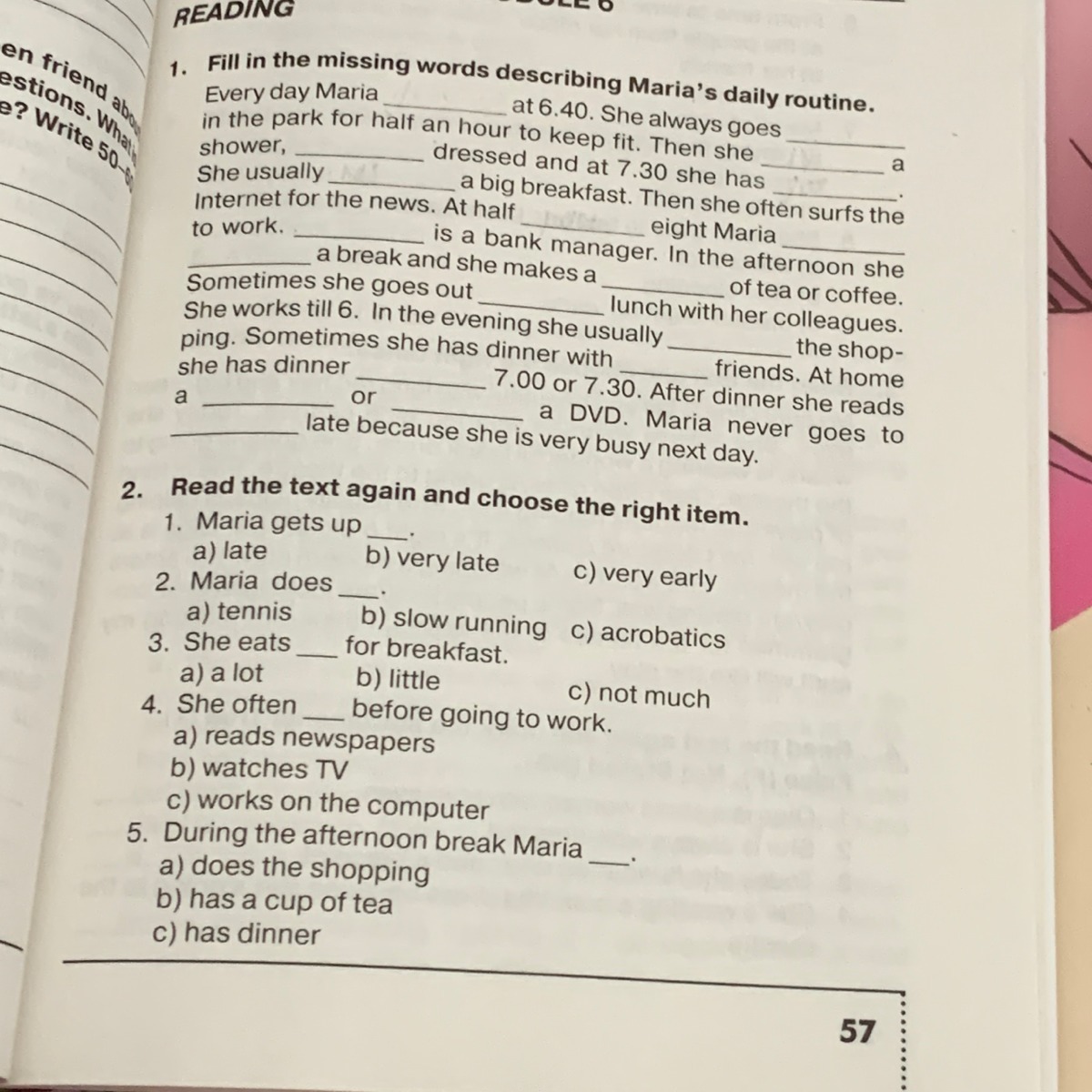Every day Maria WAKES UP at 6.40. She always goes JOGGING/SLOW RUNNING for half an hour to keep fit. Then she TAKES a shower, then? dressed and at 7.30 she has BREAKFAST???. She usually HAS a big breakfast. Then she often surfs the internet for the news. At half PAST eight Maria GOES to work. SHE is a bank manager. In the afternoon she HAS a break and she makes a CUP of tea or coffee. Sometimed she goes ? lunch with her colleagues. She works till 6. In the evenig she usually GOES the shopping. Sometimes she has dinner with HER friends. At home she has dinner AT 7.00 or 7.30. After dinner she reads BOOKS or WATCHES a DVD. Maria never goes to BED late becaue she is very bust next day.