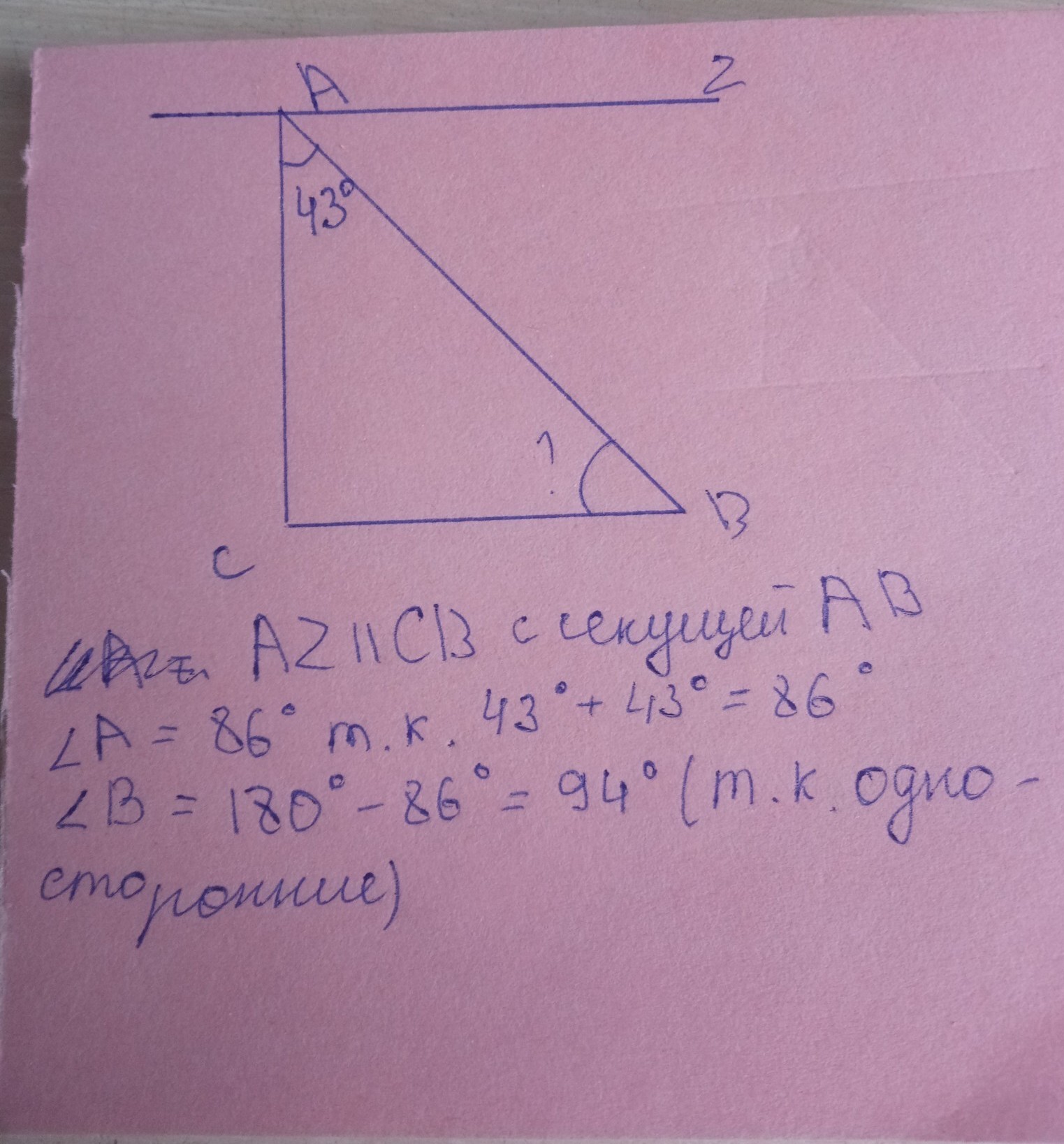 Через вершину А треугольника АВС с прямым углом С проведена прямая,параллельная стороне ВС. Найдите угол В треугольника АВС,если угол САВ=43°.