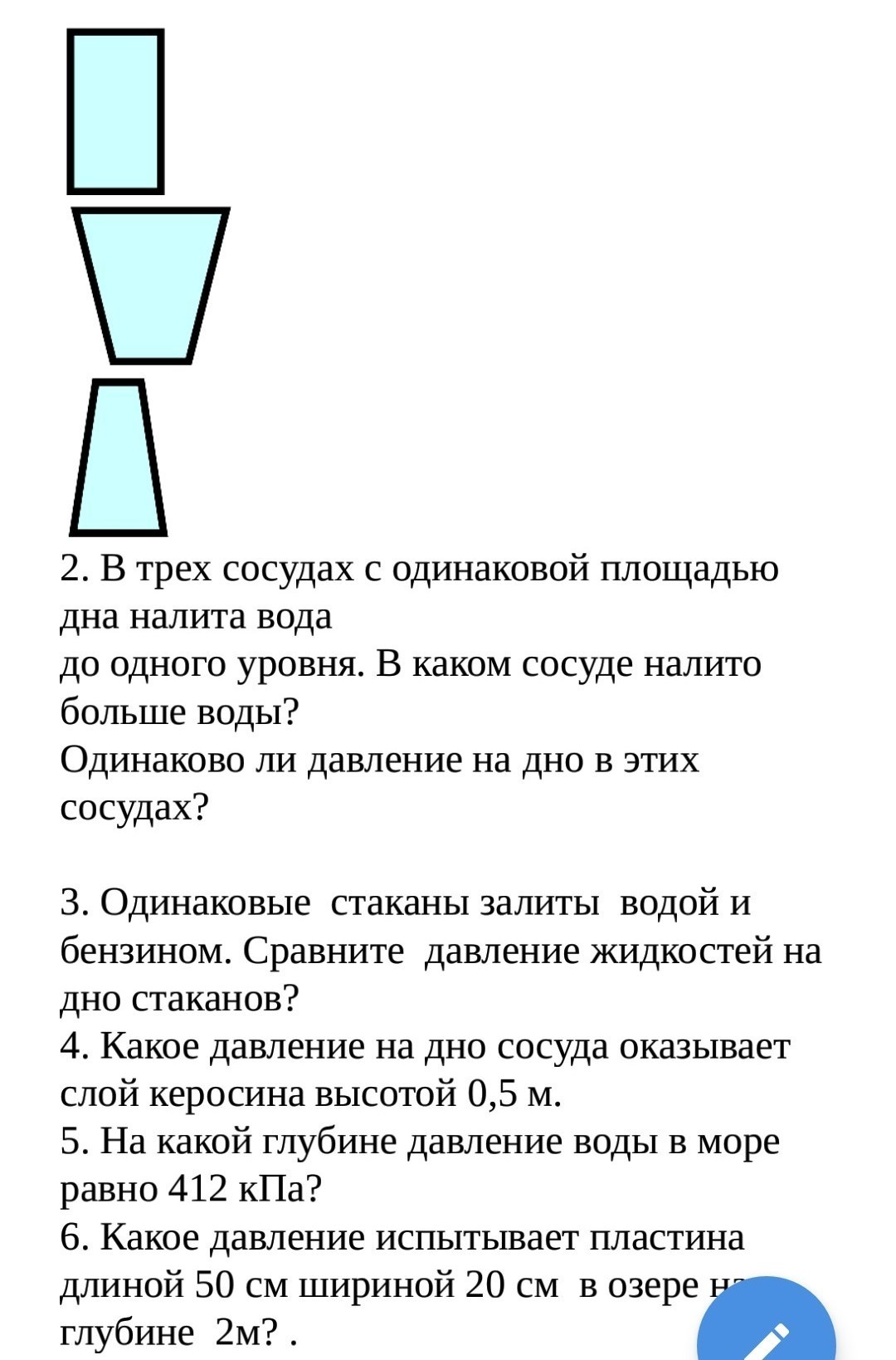 4. давление на дно сосуда определяется формулой P=плотность*ускорение св. падения тел*высота