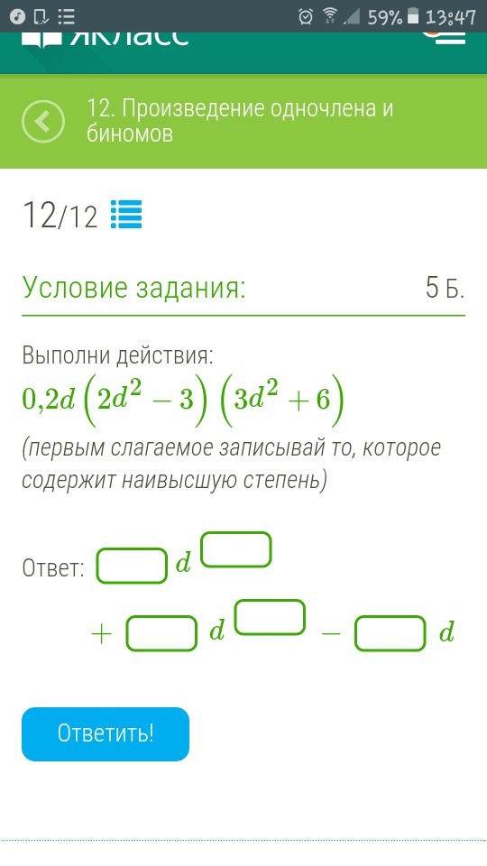 0,2d * (2d² - 3) * (3d² + 6) = (0.4d³ - 0.6d) * (3d² + 6 ) = 1.2d⁵ - 1.8d³ + 2.4d³ - 3.6d = 1.2d⁵ + 0.6d³ - 3.6d