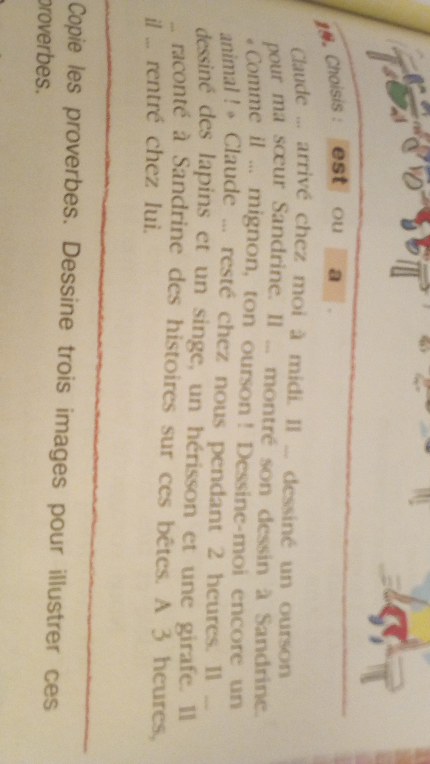 Claude est arrive chez moi a midi. Il a dessine un ourson pour ma sœur Sandrine. Il a montre son dessin a Sandrine. "Comme il est mignon, ton ourson ! Dessine-moi encore un animal !" Claude est reste chez nous pendant 2 heures. Il a dessine des lapins et un singe, un hérisson et une girafe. Il a raconte a Sandrine des histoires sur ces bêtes. A 3 heures il est rentre chez lui.