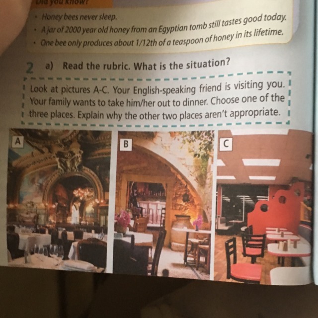 Look at pictures a-c. Your English-speaking friend is visiting you. Your family wants to take him/her out to dinner. Choose one of the three places. Explain why the other two places aren’t appropriate.