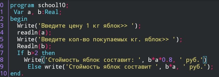 Else write('Стоймость яблок составит ', b*a, ' руб.');