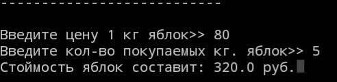 Write('Введите цену 1 кг яблок>> ');