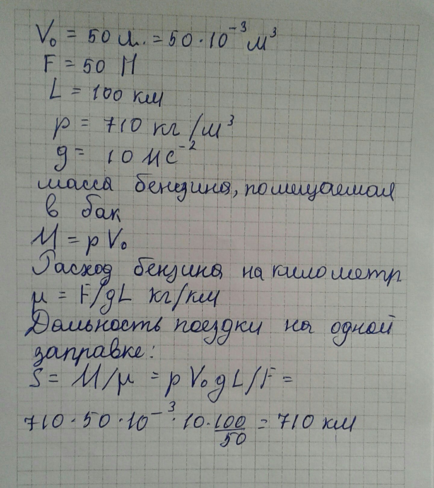 Вместимость топливного бака автомобиля 50 л. Вес бензина расходуемого на путь 100 км, составляет 50 Н. Плотность бензина 710 кг/м³. Определите максимальный путь, который может проехать автомобиль после одной заправки.