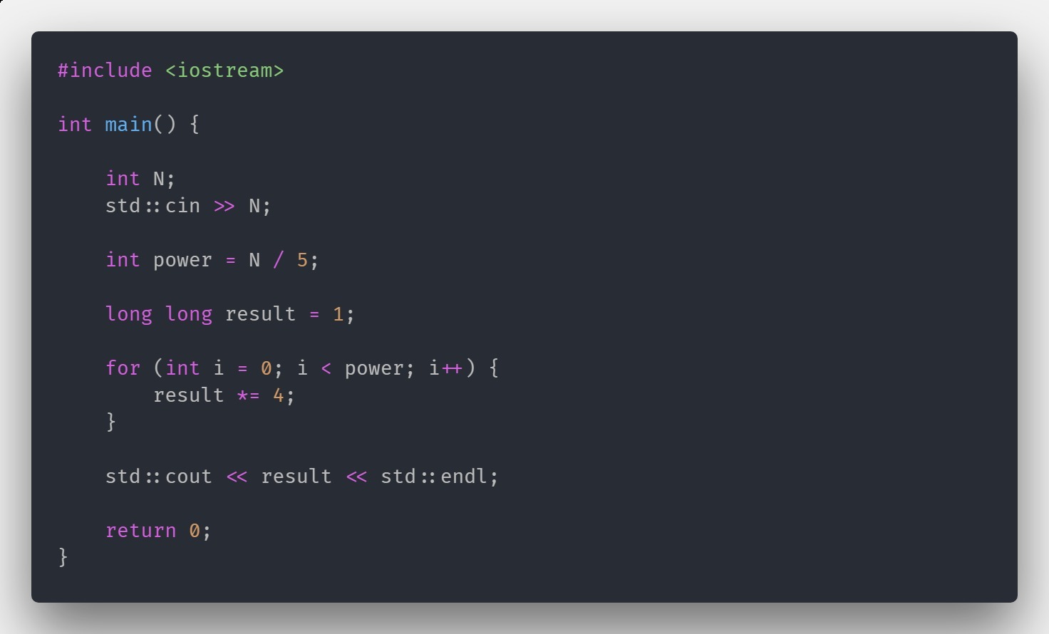клетки грибов делятся на четыре части каждые пять минут. Определите, какое количество клеток будет через N минут. Напишите цикл, который будет определять количество клеток через N-минут (N-целое число, вводимое с клавиатуры ).