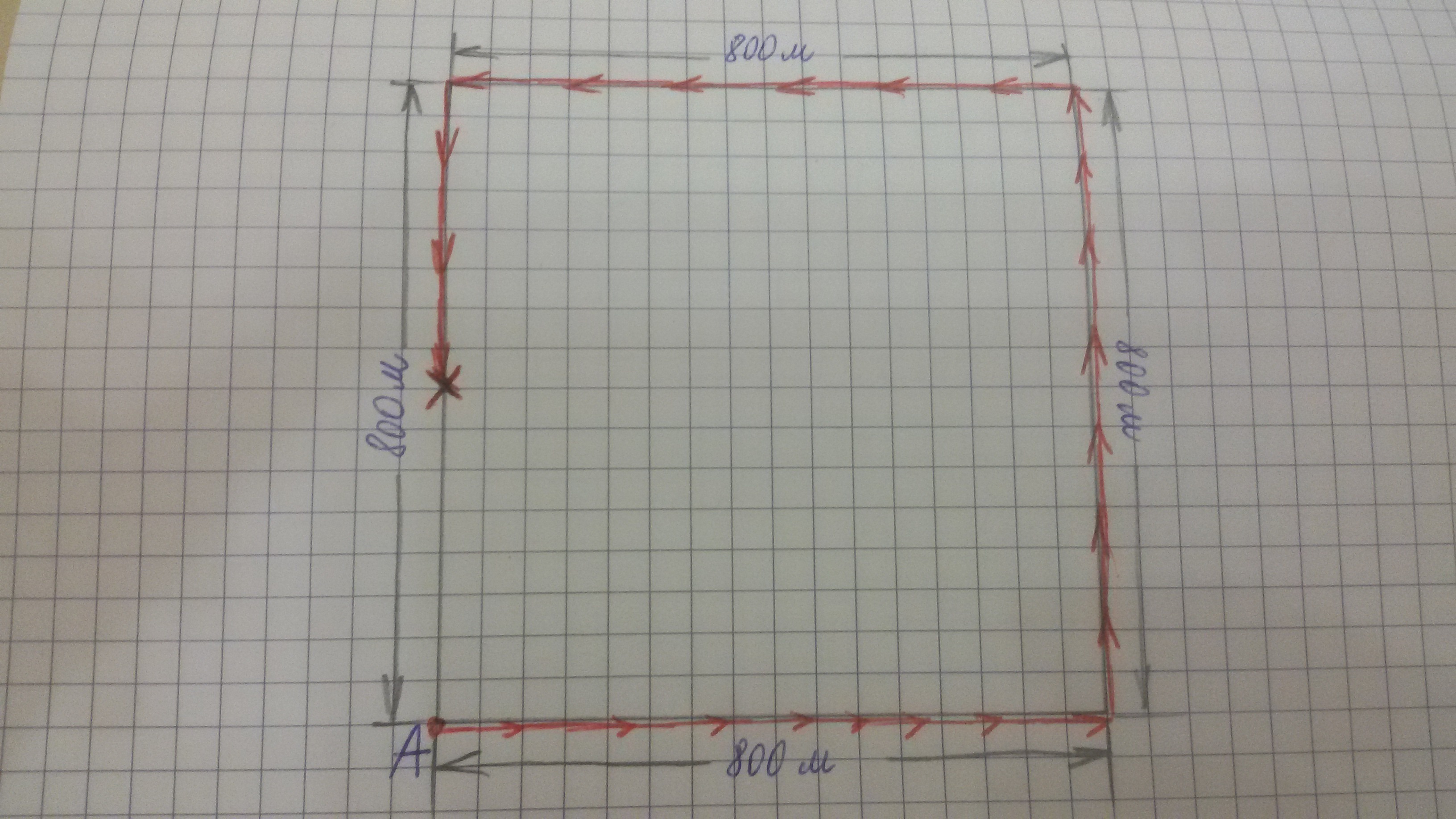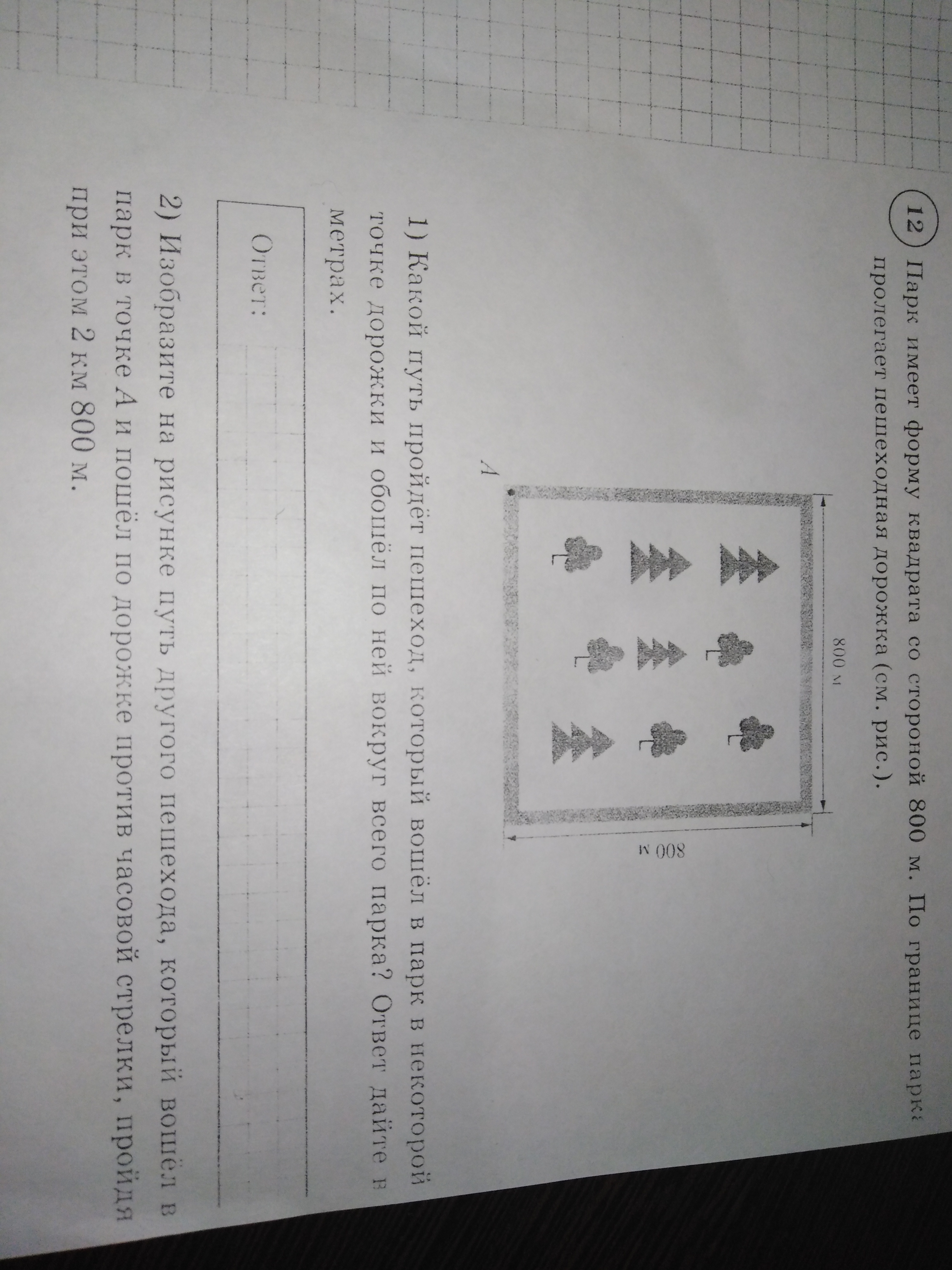 2)Красным отмечен путь второго пешехода. Поскольку он прошёл путь в 2800 м, то он не обошёл весь парк по периметру, он прошёл 3 стороны по 800 м 3 * 800 = 2400 м) и половину четвёртой стороны (800 : 2 = 400 м).
