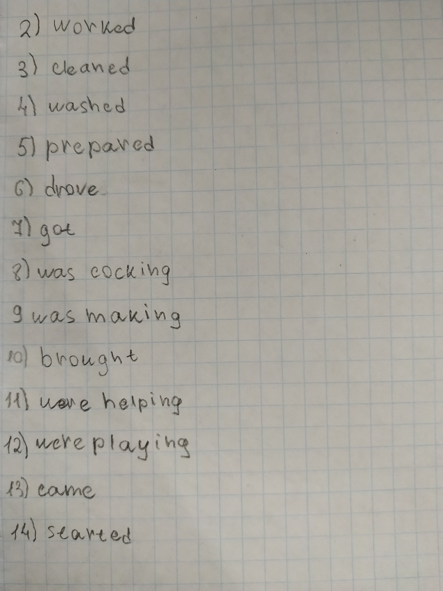 2. working, 3.cleaned,4. washed 5. prepared 6. drove 7. were getting 8.was cooking 9. was making 10. brought 11. was helping 12. was playing 13. came 14. started