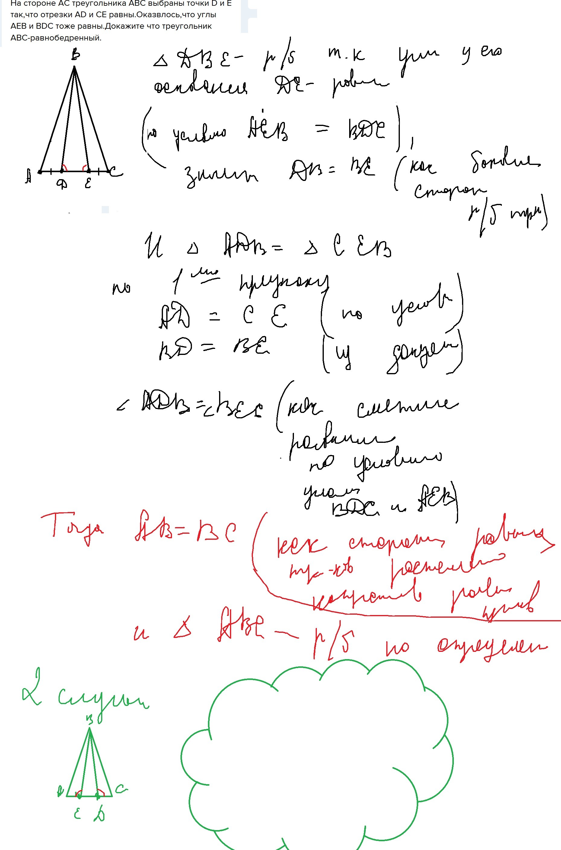 На стороне АС треугольника АВС выбраны точки D и E так,что отрезки АD и СЕ равны.Оказвлось,что углы АЕВ и ВDC тоже равны.Докажите что треугольник АВС-равнобедренный.