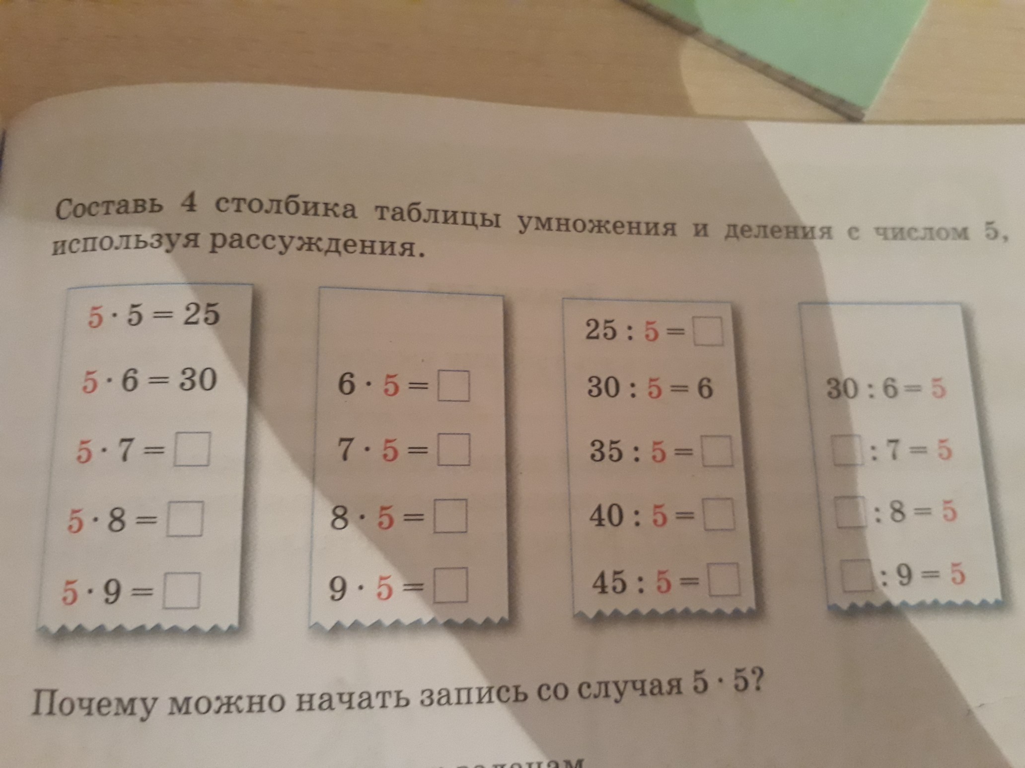 Составь четыре столбика таблицы умножения и деления с числом 5 используя рассуждения
