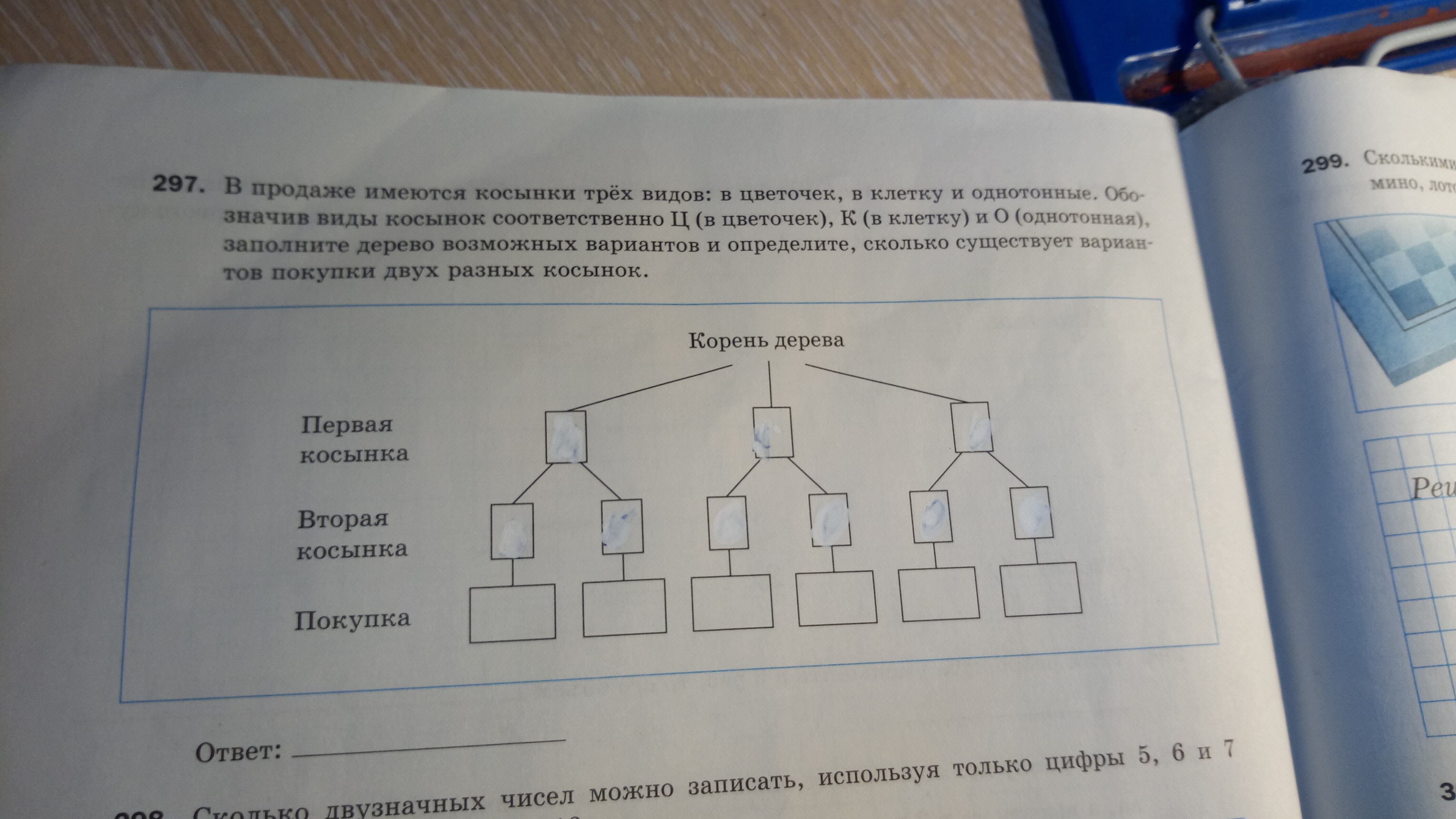 В продаже имеются косынки трёх видов: в цветочек в клетку и однотонные.Обозначив виды косынок соответственно Ц(цветочек)К(клетку)О(однотонные) заполните дерево возможных вариантов и определитель сколько существует вариантов покупки друх косынок