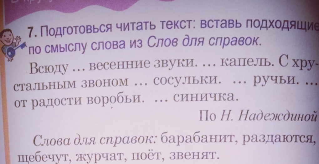Всюду раздаются весенние звуки. Барабанит капель. С хрустальным звоном звенят сосульки. Журчат ручьи. Щебечут от радости воробьи. Поёт синичка.