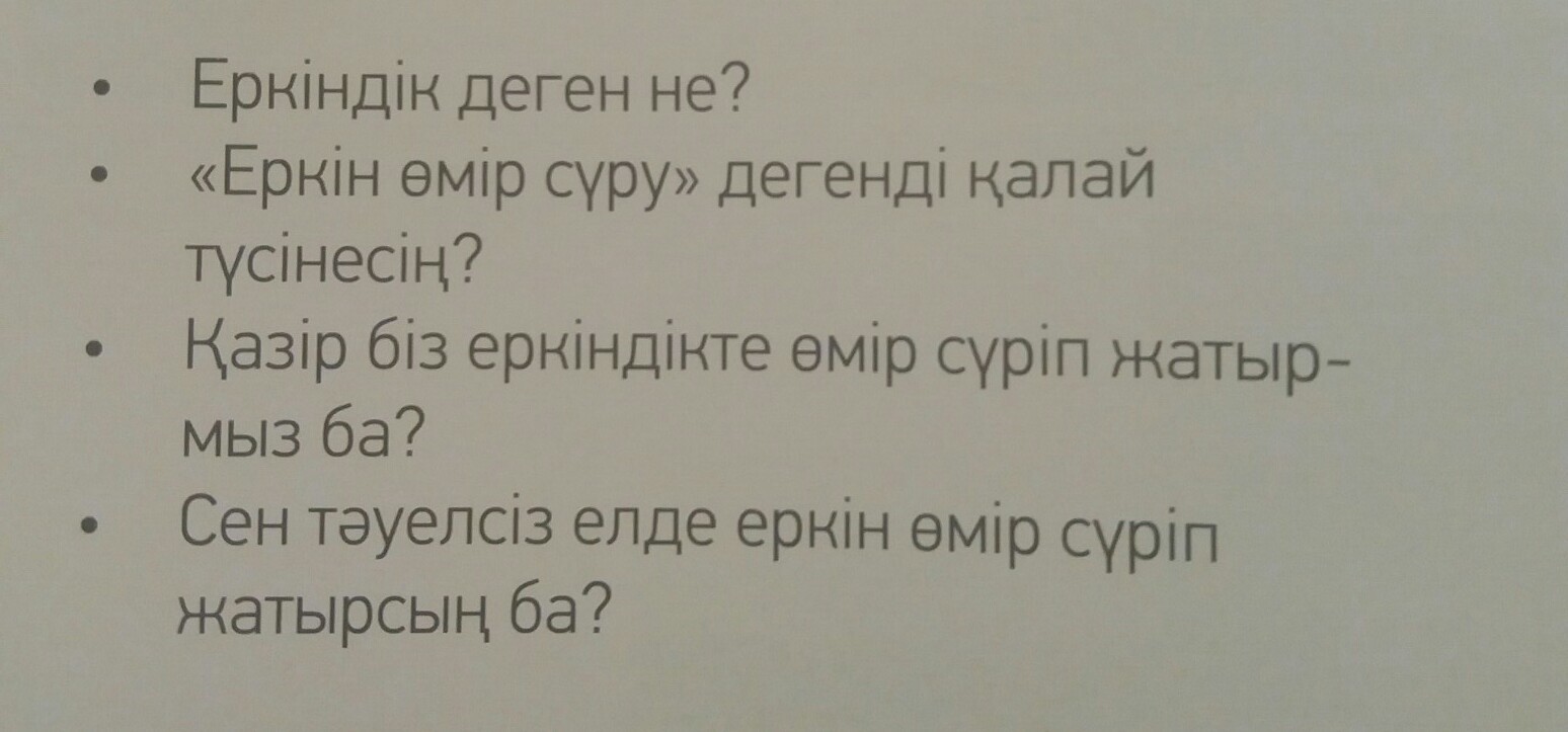 Бурынгы кезде казак халкы орыстарга тауелды болып келды.Ал казыр Кудайга шукыр тауелсыздыгымызды алып бейбыт омыр сурып келемыз.Бырак бул тауелсыздыкке жету ушын ата-бабамыз кан тогып,тер токты.Сондай-ак быз казыр ешкымге тауелсыз емеспыз.Еркын омыр сурудемыз.Мен еркын омыр суруды осылай тусынемын.