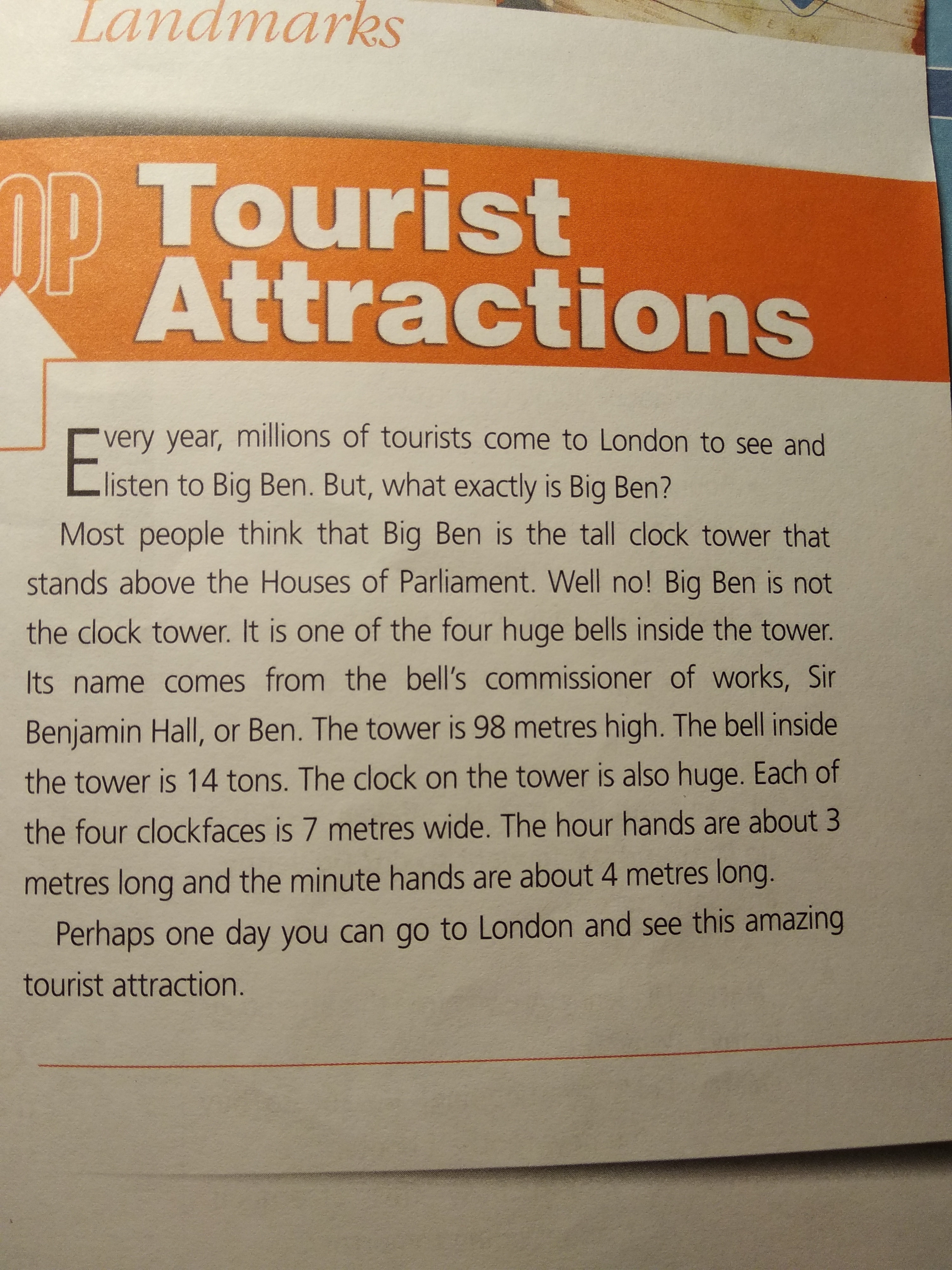 Большинство людей думают, что Биг Бен это высокая башня с часами, которая стоит над Домом Парламента. Но нет! Биг Бен это не часовая башня. Это один из четырех огромных колоколов работы комиссара сэра Бэнджамина Холла или Бена. Башня высотой 98 метров. Колокол внутри башни такой же огромный. Каждый из четырех часовых циферблатов 7 метров шириной. Часовые стрелки около 3 метров длиной, а минутные стрелки около 4 метров длиной.