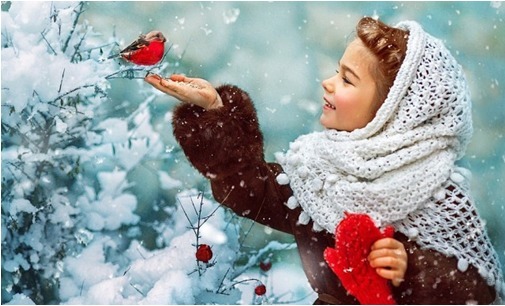 На картинке изображена светловолосая,милая и прилежная девочка.Мы ее видим в коричневом полушубке,закутанай в белый вязаный шарф и держащей в руке красную варежру.В этот момент она наблюдает на красным,зимнем снегирем,сидевшем на ветке куста,окутанного пушистым снегом.В выражении лица девочки можно описать разные черты.Такие как:радость,веселье,заинтересованость,милота.И это всё изображено в одной картинке.