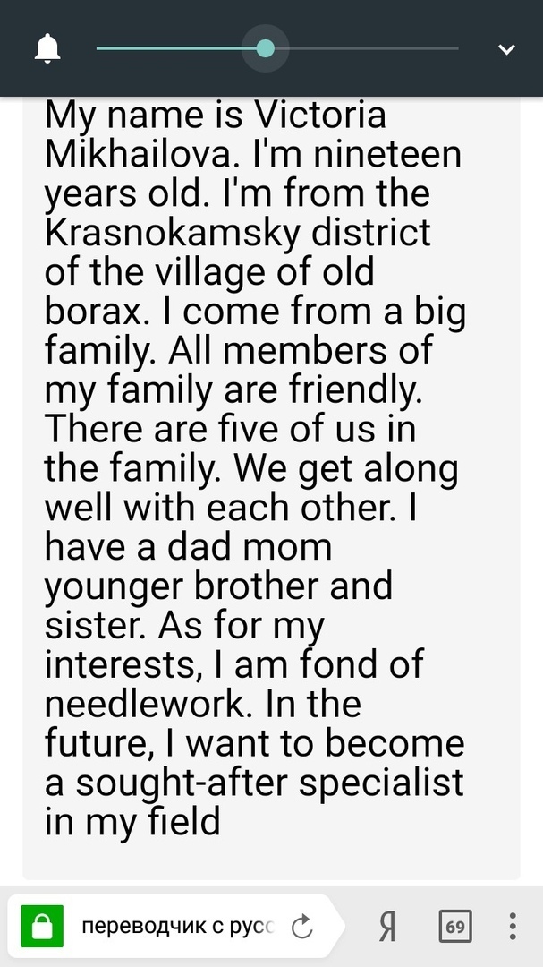 май нэйм из Виктория микшайлова. айм найнтин еарс Олд.айм фром зэ краснокаменский дистрикт оф зэ вилладже оф Олд борэкс.ай ком фром э биг фэмэли. Олд мемберс оф май фэмэли а френдли. зере а файв оф ас ин зэ фэмэли.ви гэт э лонг. вэлл виз ич озер.ай хав а дад мом йангер брозе энд систэ.ас фо май интерест ай эм фонд оф нидлворк. ин зэ фьюче ай вонд ту бекам э соуз афтэ спешиалист ин май Филд. Прямо так и читай!