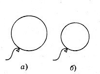 На рисунке изображен воздушный шарик, наполненный водородом, в момент, когда его выпустили из рук, и спустя некоторое время, когда он поднялся на некоторую высоту над землей. На каком из рисунков (а или б) изображен шарик, поднявшийся на высоту?