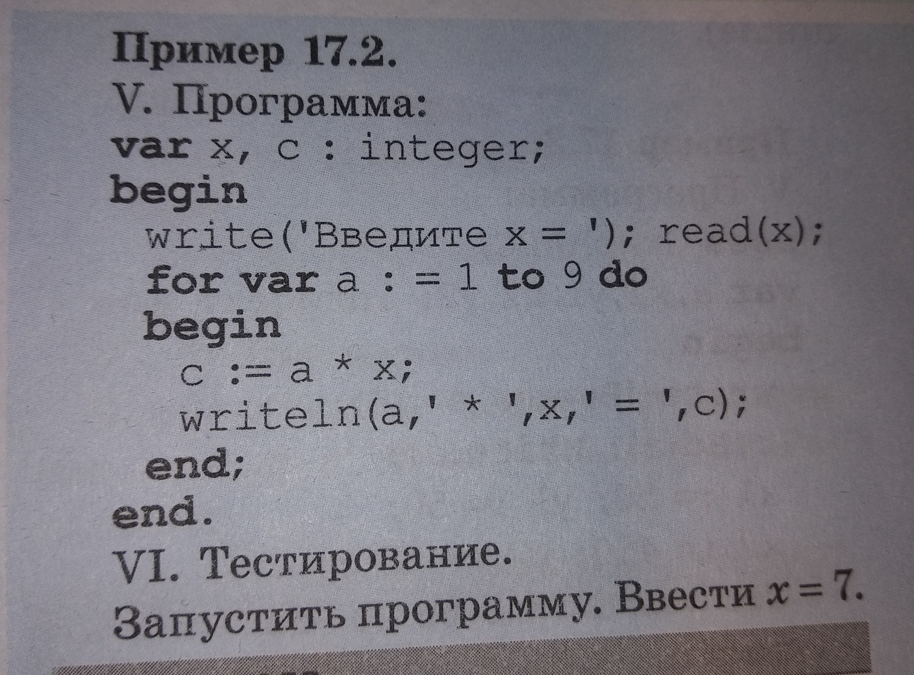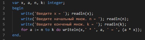 for a := n to k do writeln(x,' * ', a, ' = ', (a * x));