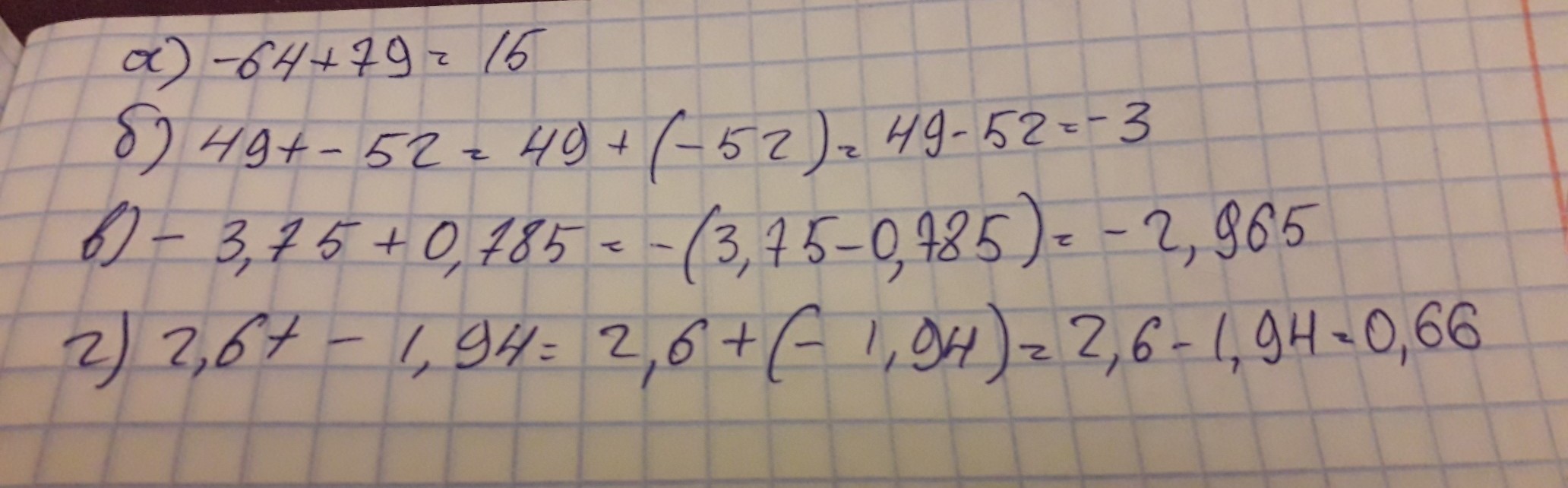 выполните сложение А минус 64 плюс 79 б 49 Плюс Минус 52 в минус 3,75 плюс 0,785 г 2,6 + - 1,94
